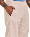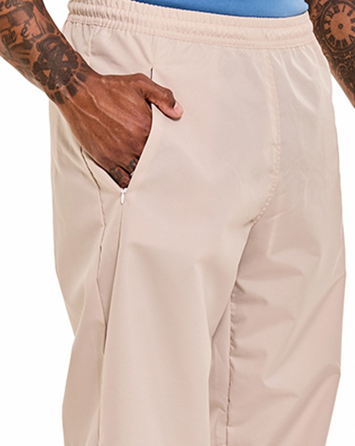O caimento reto garante liberdade de movimentos, enquanto o cós elástico com cordão interno regula o ajuste com praticidade. Possui bolsos laterais com zíper embutido e bolso traseiro — todos pensados para manter itens seguros — além de bolso interno para objetos menores.