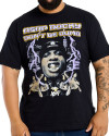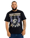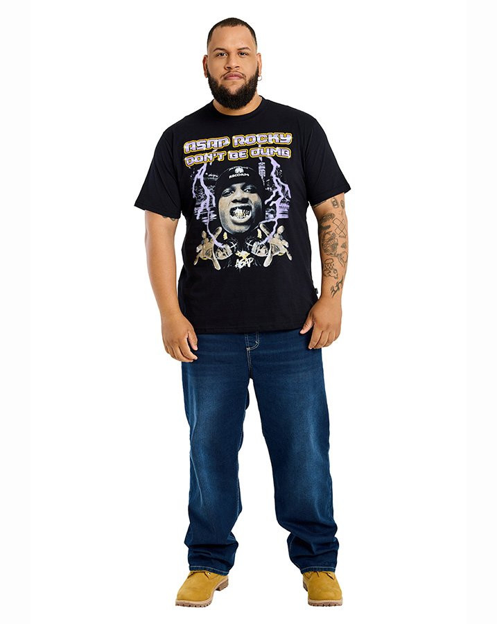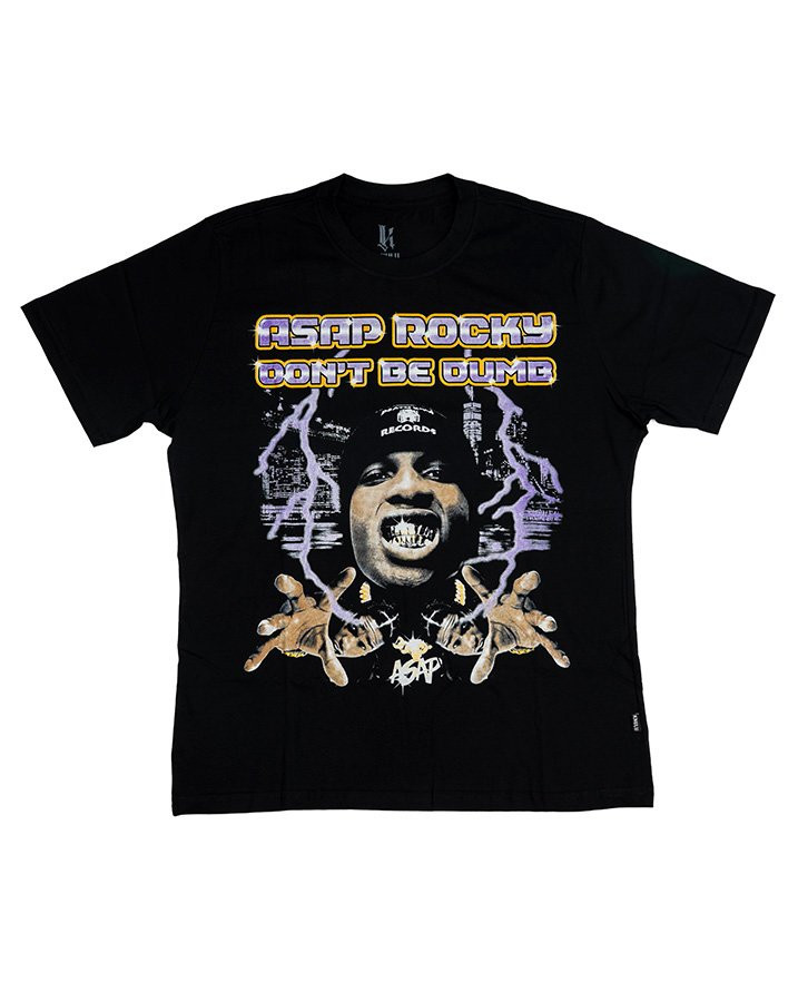 A Camiseta Classic Asap Rocky Preto Knulu traz uma estampa frontal vibrante que mistura elementos gráficos urbanos com a frase “Don’t Be Dumb”, referência direta ao universo visual do artista. A arte combina roxo, dourado e preto em composição de alto contraste, com destaque para o retrato central estilizado e elementos visuais que remetem ao street rap contemporâneo.
