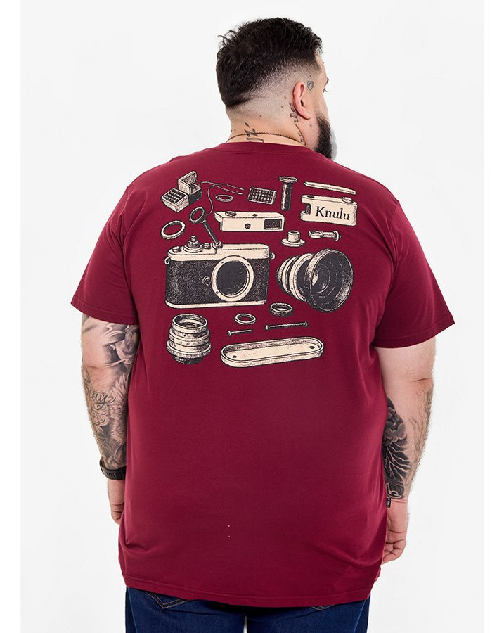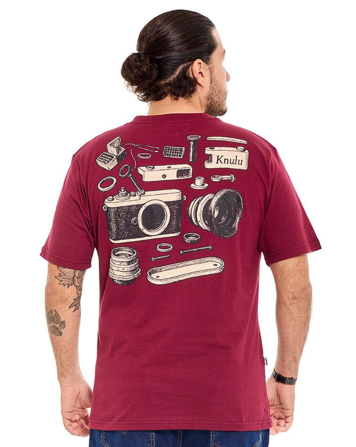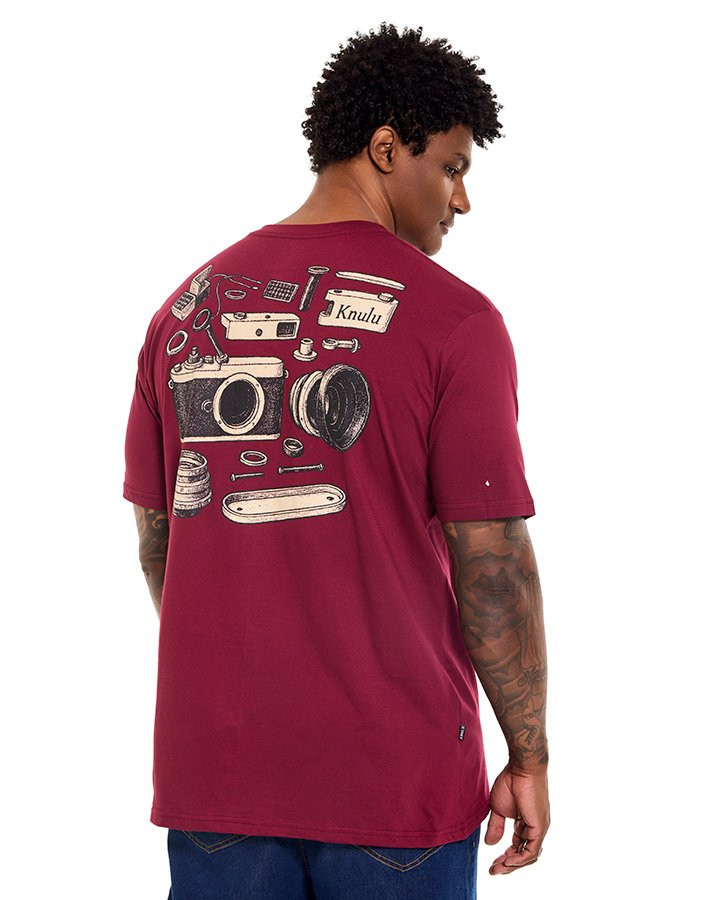A Camiseta Classic Camera Explosion Bordo Knulu destaca-se pelo design criativo e detalhado nas costas, onde uma câmera clássica é apresentada em vista explodida, revelando suas peças em composição artística. A estampa amplia a conexão com o universo da fotografia e reforça a proposta da coleção Explorer, que valoriza o olhar atento aos detalhes.