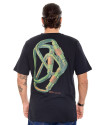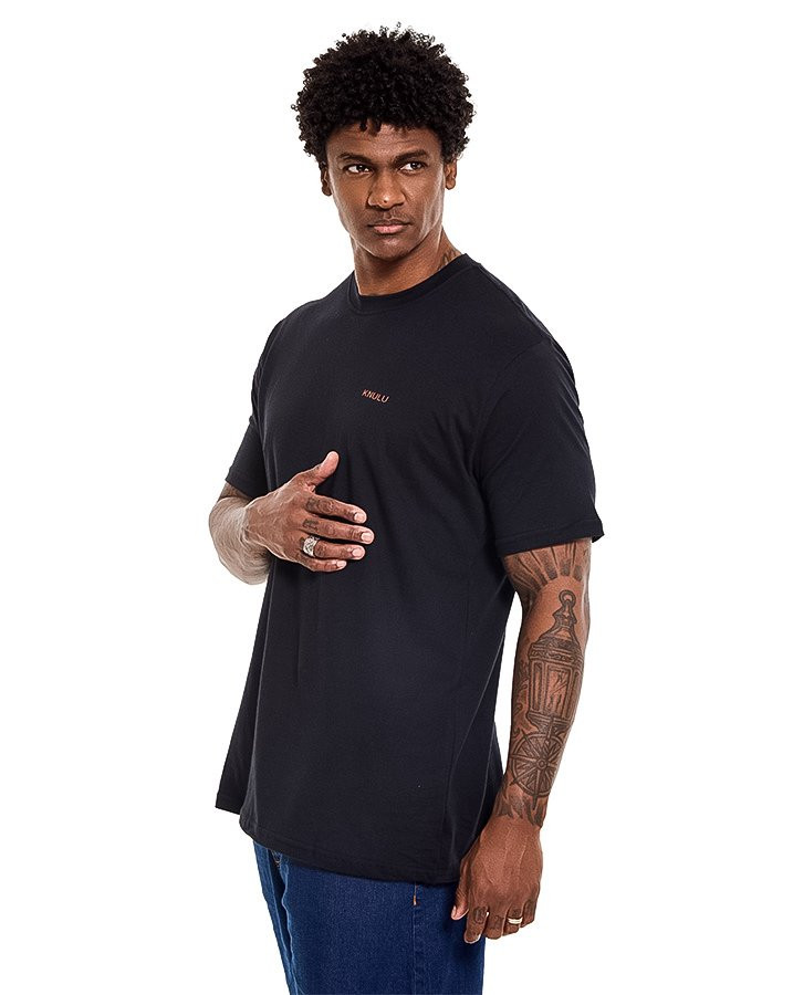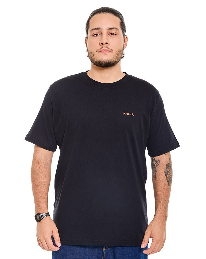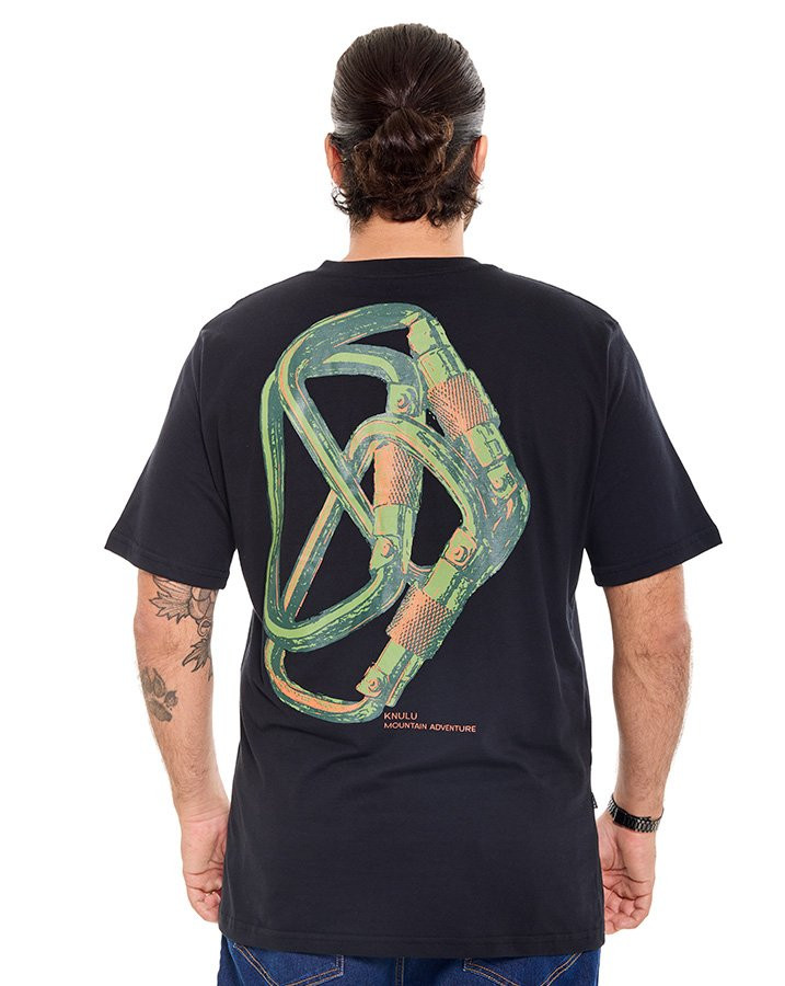 A Camiseta Classic Carabiner Clip Preto Knulu traz um visual marcante com inspiração no universo da escalada, integrando a proposta da coleção Explorer. O destaque fica para a estampa nas costas, que apresenta ilustração em silk screen de mosquetões sobrepostos em cores contrastantes, reforçando a estética outdoor da peça.