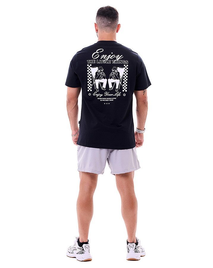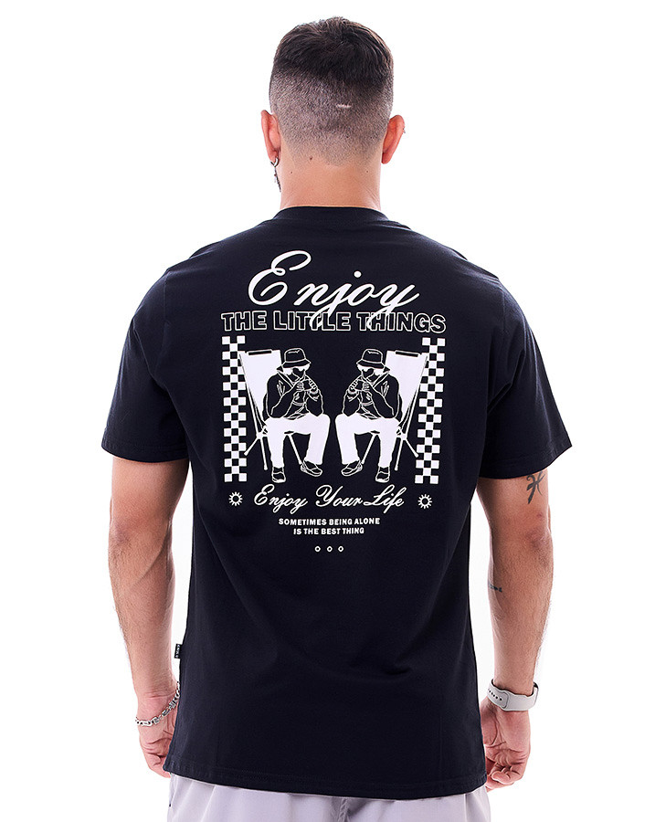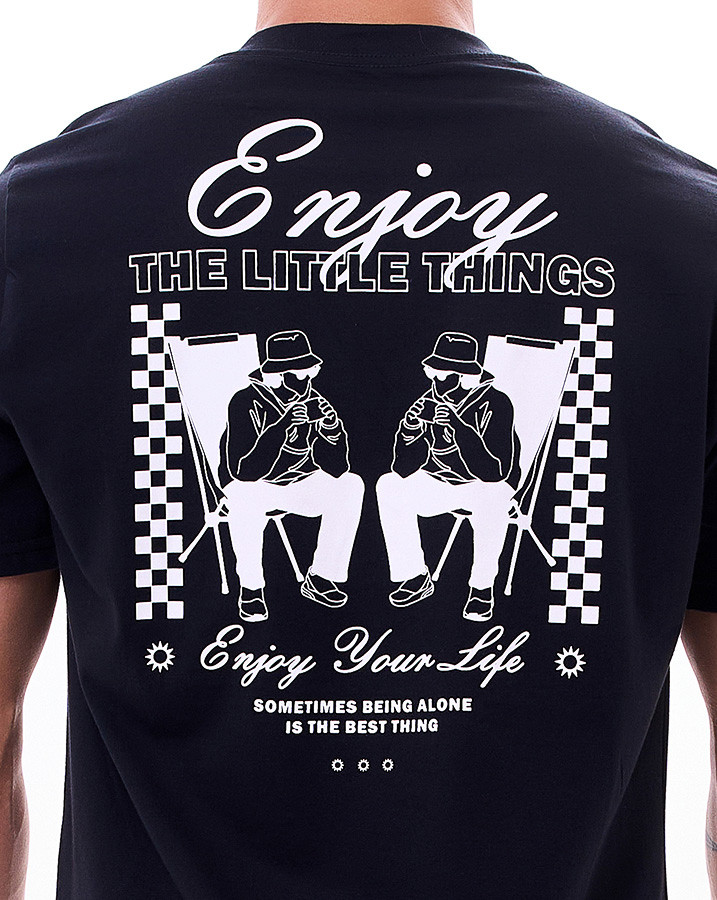Confeccionada em malha leve e resistente, a peça proporciona toque macio e excelente respirabilidade. O destaque fica para a estampa nas costas com ilustração em estilo monocromático e a mensagem “Enjoy the little things”, reforçando um visual urbano com apelo reflexivo.