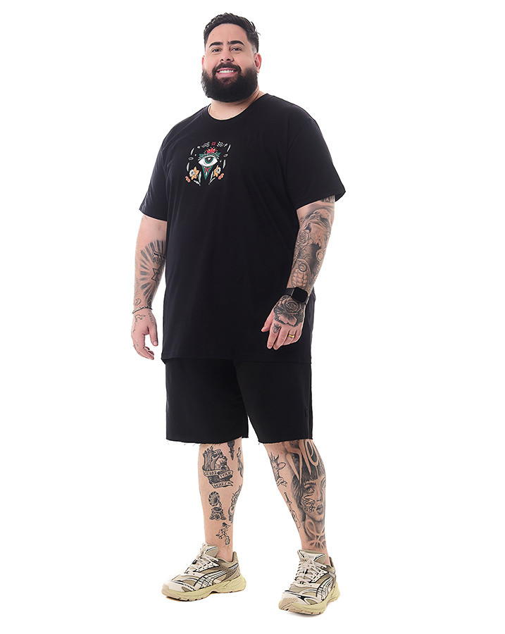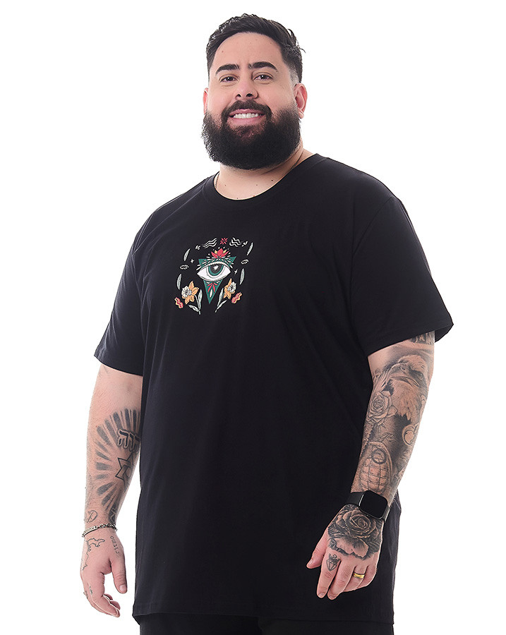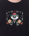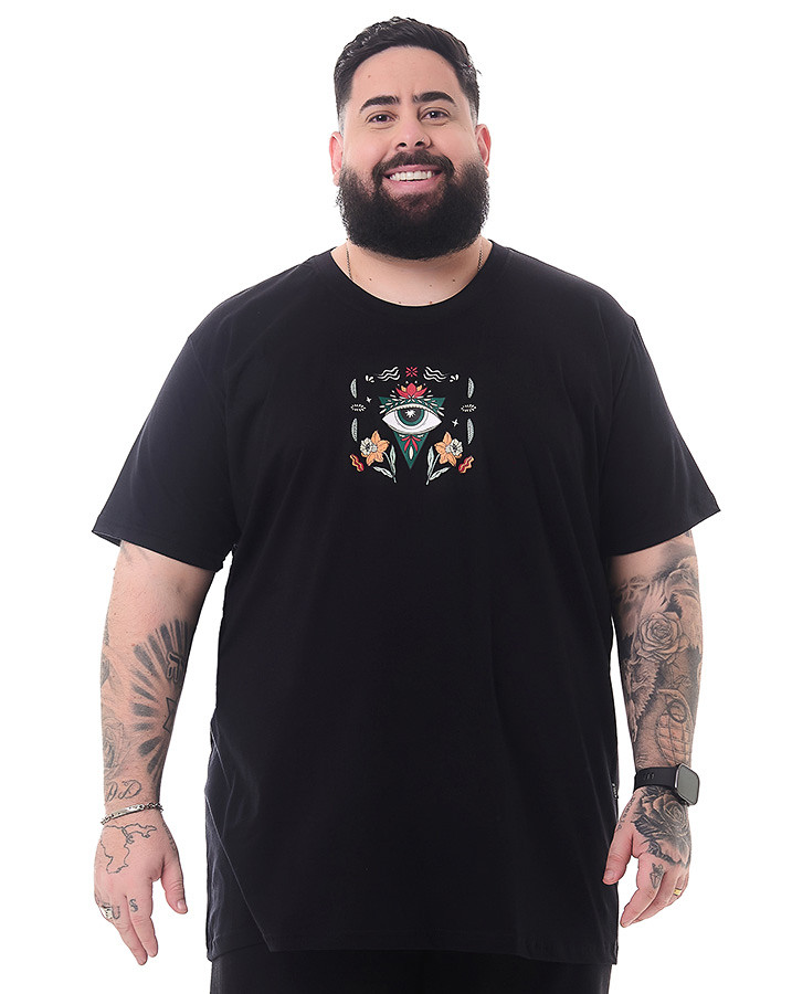 O grande destaque vai para a estampa frontal: um olho estilizado cercado por elementos geométricos e florais em tons vibrantes de verde, laranja e vermelho. Essa combinação de cores e formas cria uma atmosfera única, perfeita para quem quer expressar sua identidade com um toque de arte e simbologia.