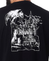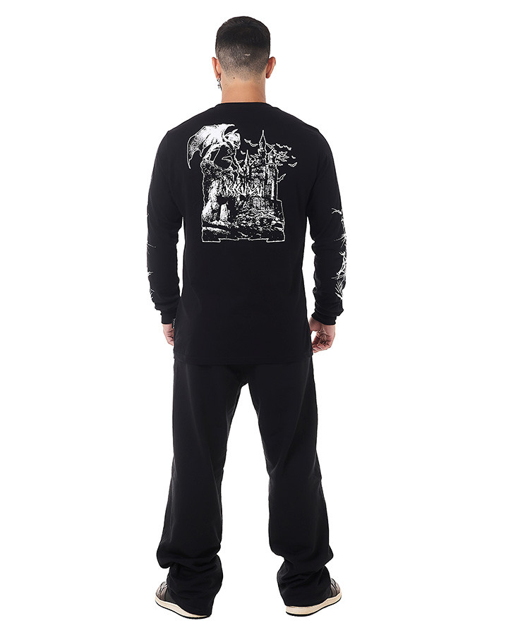 Destacando-se na frente, a estampa em silk screen em branco apresenta um knulu estilizado, adicionando um toque de personalidade ao visual. Nas mangas, linhas abstratas que lembram várias teias criam um visual único e intrigante. Nas costas, um silk de um castelo em um morro com pássaros no fundo e uma gárgula no canto direito acrescenta um toque de mistério e sofisticação.