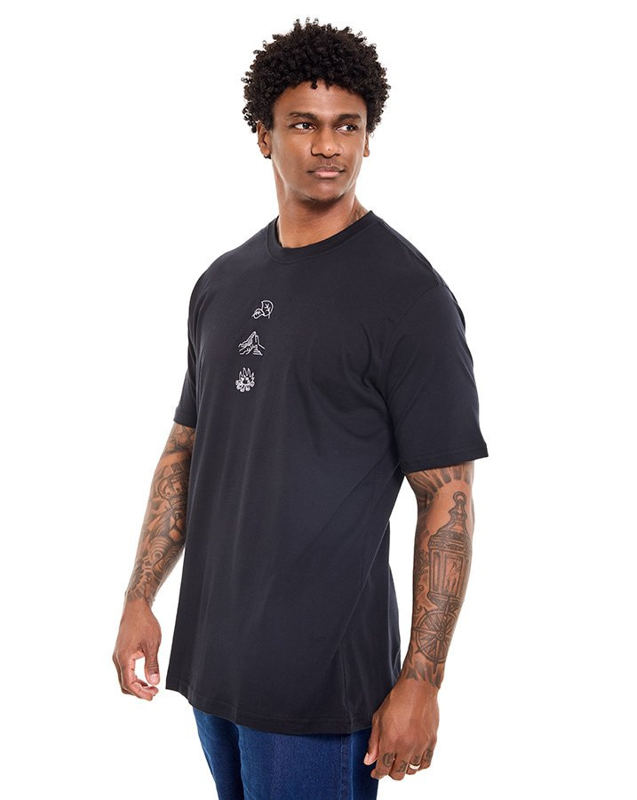 A Camiseta Classic Mountain Icons Preto Knulu traduz o espírito outdoor em um visual discreto e atemporal. Na parte frontal, o bordado centralizado exibe três ícones da vida ao ar livre — folha, montanha e fogo —, reforçando a conexão com a natureza mesmo em um look urbano.