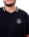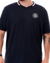Seu padrão chevron traz uma estética moderna e discreta, enquanto a gola V com recorte em malha canelada, realçada por um detalhe contrastante em branco, adiciona um toque sutil de contraste e sofisticação. As mangas curtas com barra simples garantem liberdade de movimento, tornando a peça perfeita para rotinas ativas ou momentos casuais.