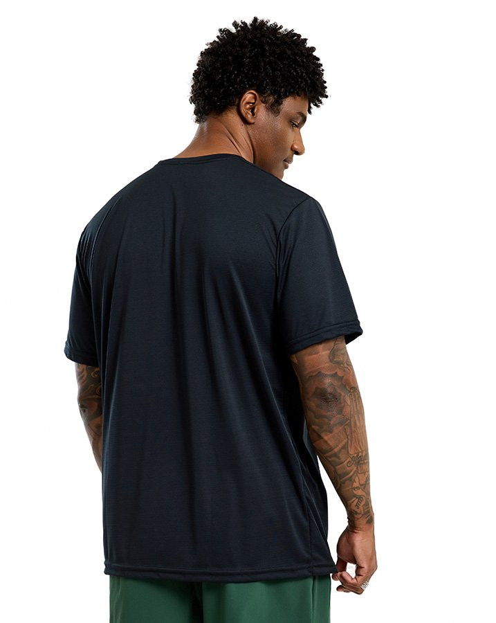 Camiseta preta Dry-Fit com textura discreta e logo refletivo que reage à luz. Alta respirabilidade, secagem rápida e conforto durante o uso.