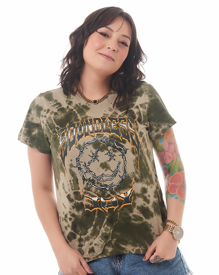 A estampa, com um escrito "boundless joy" e um smile desenhado, adiciona um toque de positividade e estilo descontraído ao seu visual.