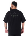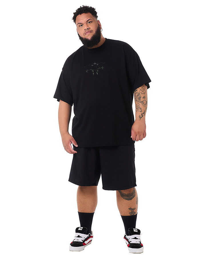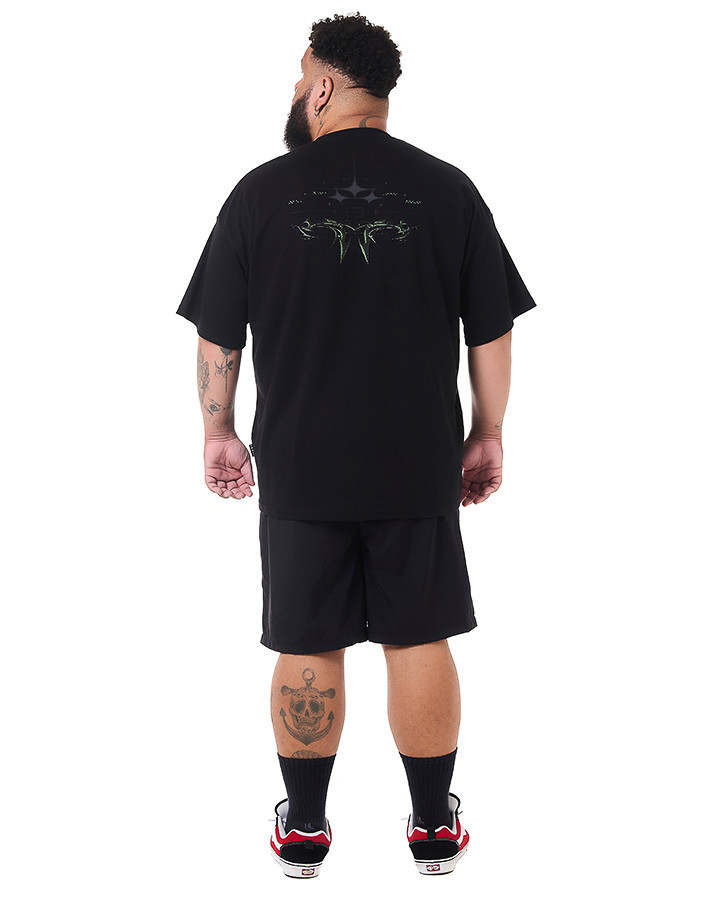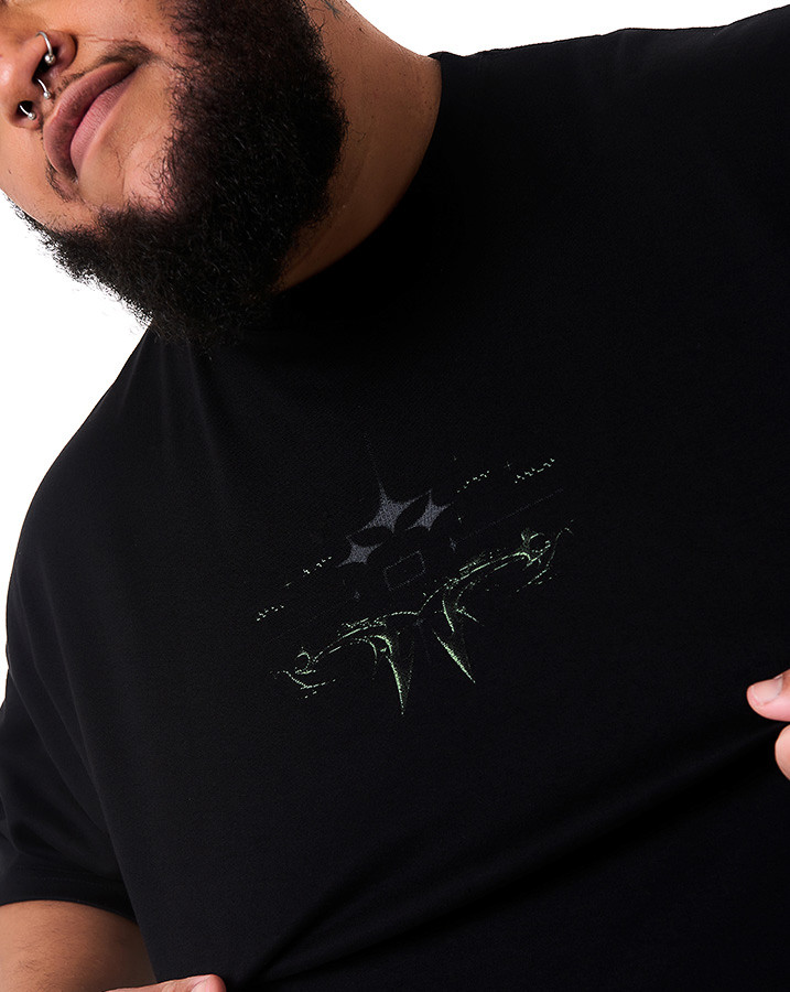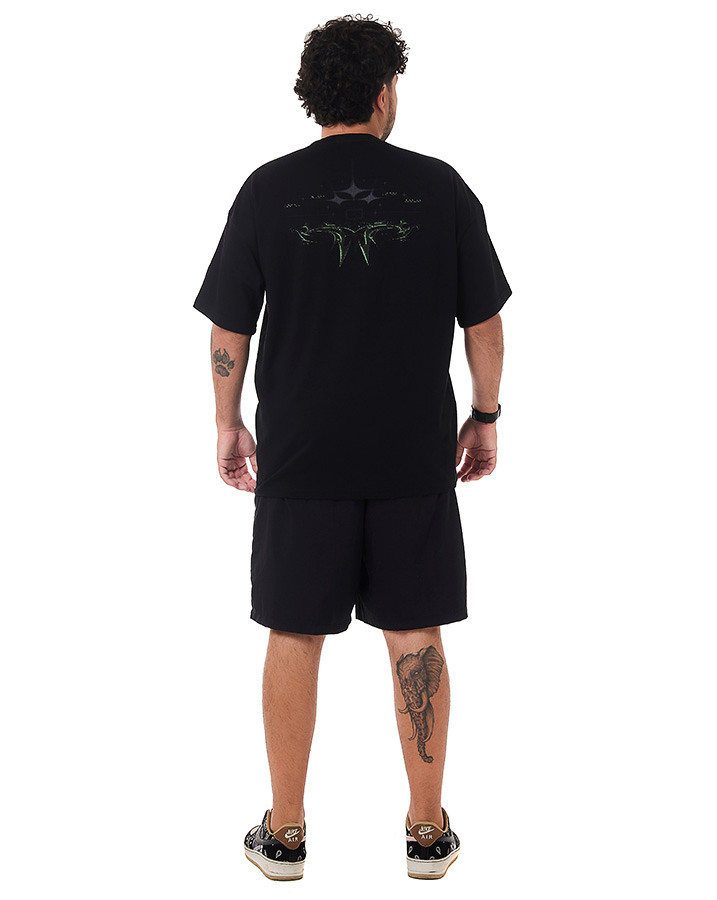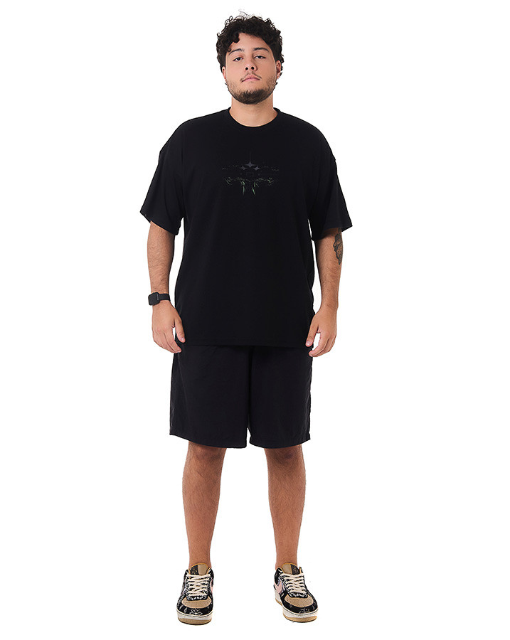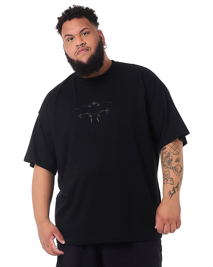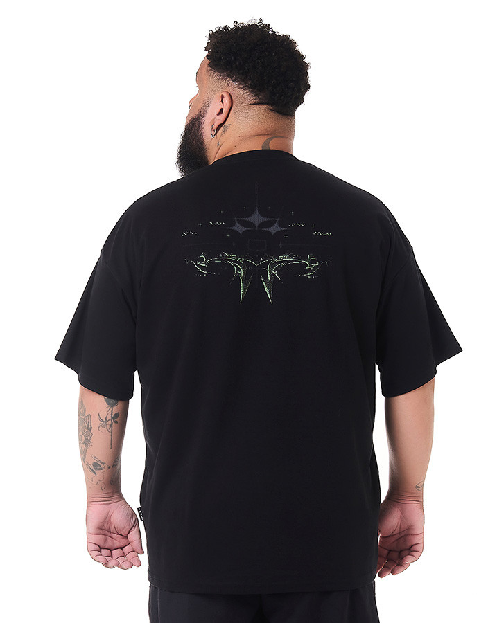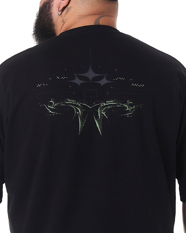 O destaque dessa camiseta é o silk na frente e atrás, apresentando um design tribaltech que brilha no escuro. Utilizando uma tinta especial, a estampa captura a luz ambiente, criando um efeito luminoso que se destaca em ambientes mais escuros.