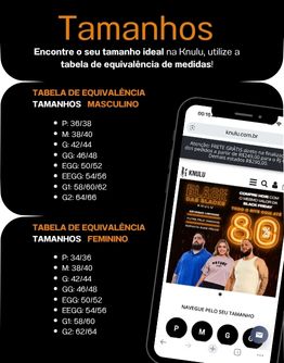 | Equivalência Regatas/Camisetas/Camisas | P: 36/38 M: 38/40 G: 42/44 GG: 46/48 EGG: 50/52 EEGG:54/56 G1: 58/60/62 G2: 64/66 |