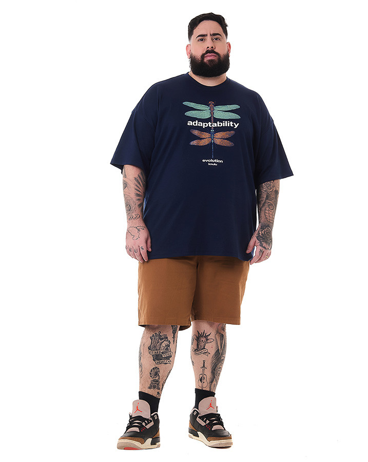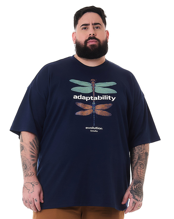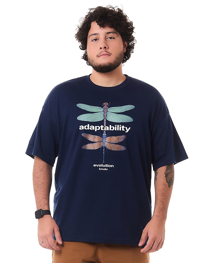 A estampa em silk screen é um destaque à parte. Com a palavra "Adaptability" e duas libélulas em tons vibrantes de laranja e verde, seguida da palavra "evolution" e do delicado logo "knulu", essa camiseta não só veste bem como transmite uma mensagem de evolução e adaptação.
