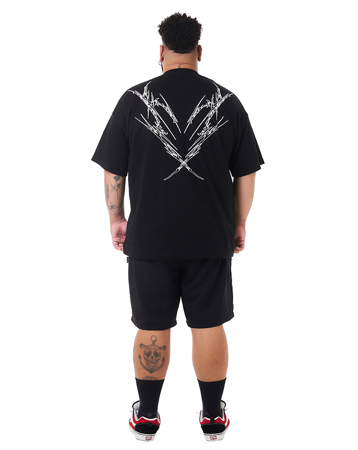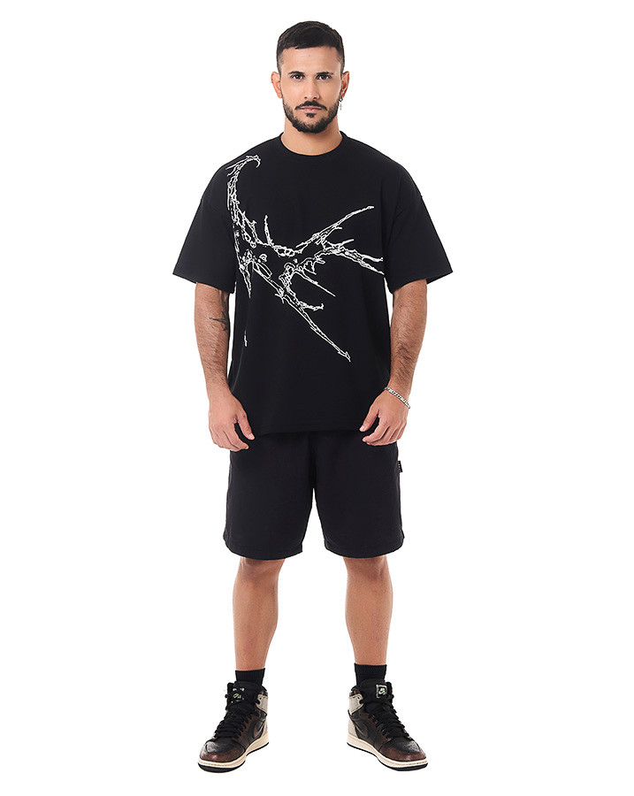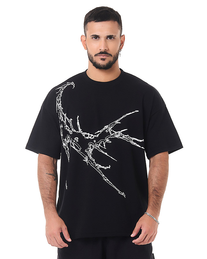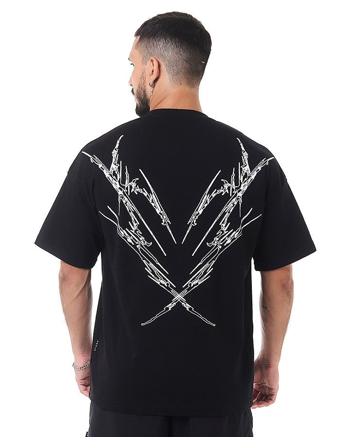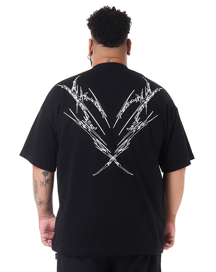 Com seu corte amplo, que oferece um visual exageradamente folgado, sendo mais larga e mais comprida, esta camiseta não só garante conforto duradouro, mas também exala um estilo descontraído e original. Os detalhes tribais em branco, tanto na frente quanto nas costas, acrescentam uma dimensão única ao seu visual.
