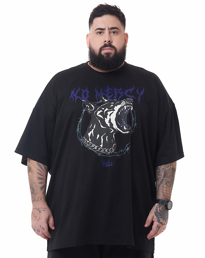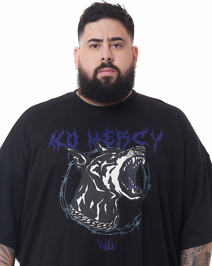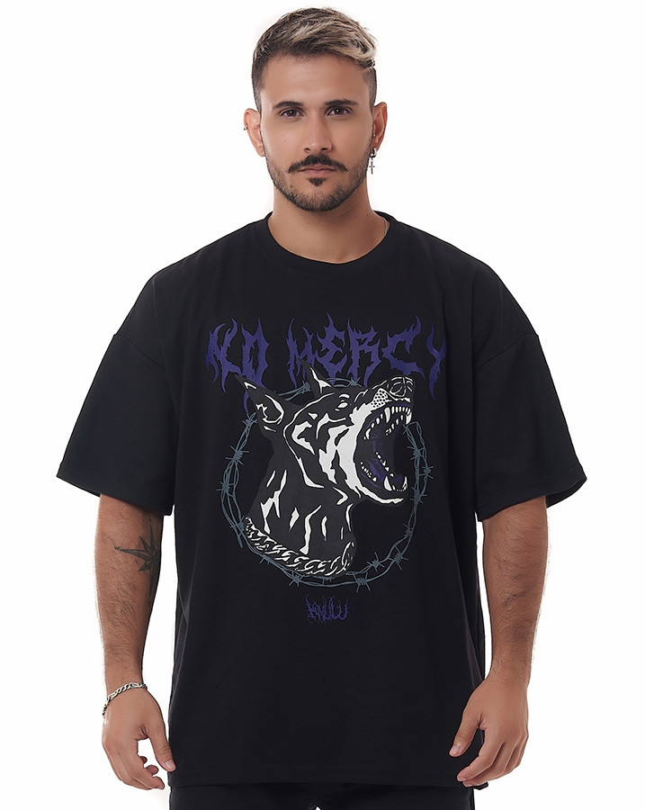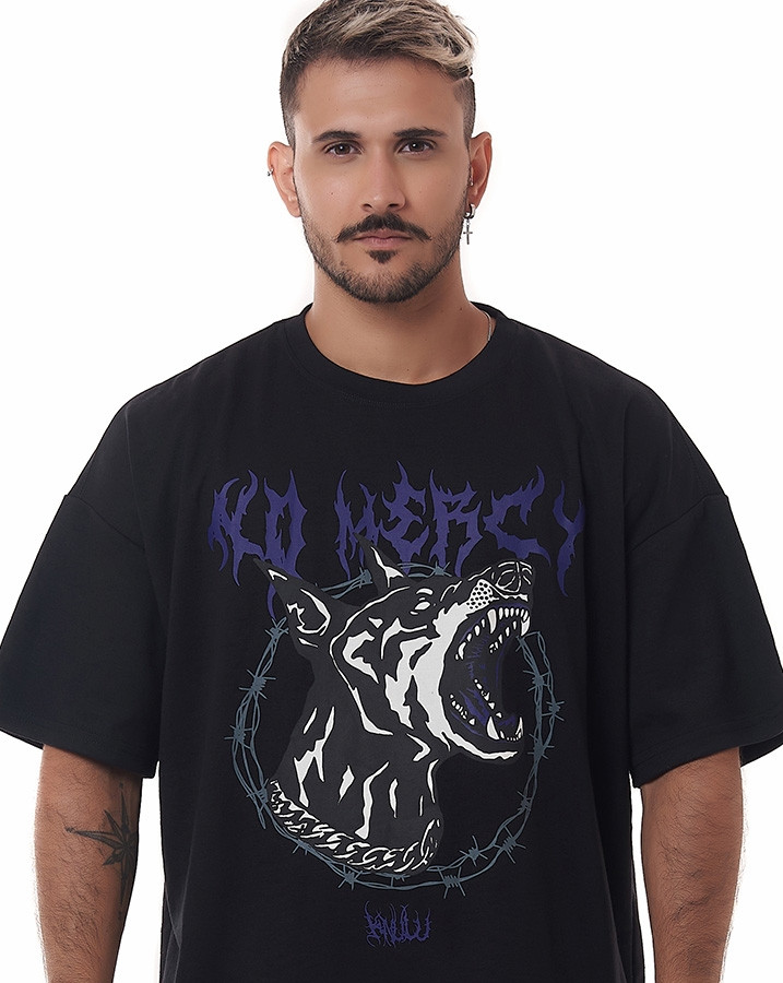 Com um corte oversized, a Camiseta No Mercy apresenta uma modelagem ampla, base reta e alongada, com o ombro também alongado, iniciando a manga já no braço. Essa característica garante um visual despojado e cheio de personalidade. A estampa em silk screen, com a frase "no mercy" e um doberman abaixo, adiciona um toque de ousadia e exclusividade à peça.