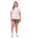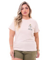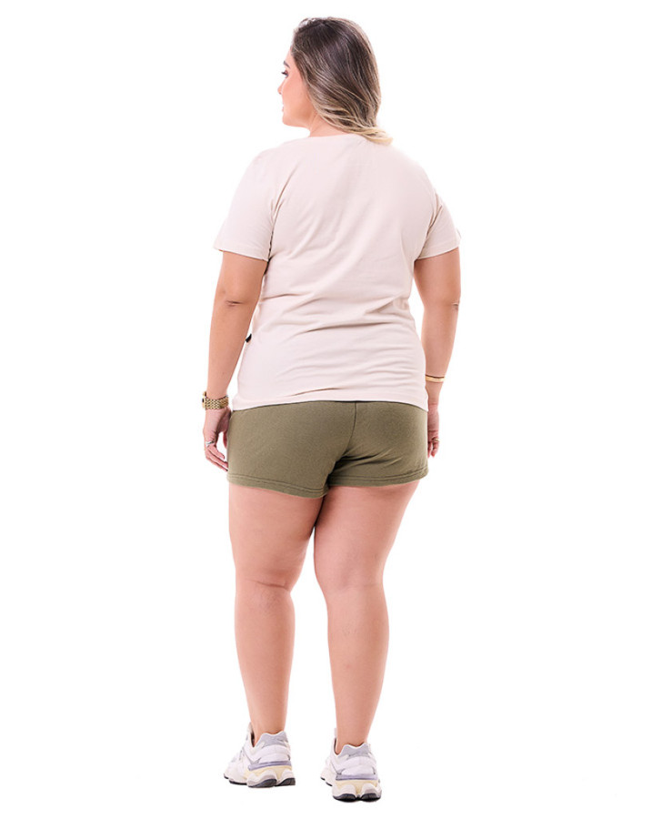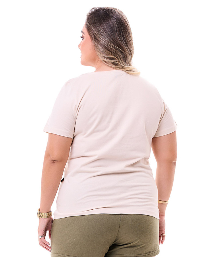 A parte de trás é lisa, sem estampas ou detalhes adicionais, mantendo a simplicidade e a elegância da peça. Ideal para compor looks casuais e confortáveis, esta camiseta pode ser combinada com calças, shorts ou saias, adaptando-se a diferentes ocasiões do dia a dia.