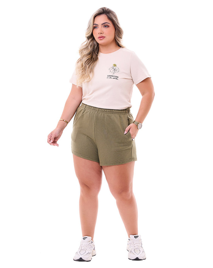 Com modelagem reta, gola careca e mangas curtas tradicionais, esta camiseta feminina se sobressai pelo design minimalista e sofisticado. Na parte frontal, do lado esquerdo do peito, há uma delicada estampa de mãos segurando uma flor amarela, com traços minimalistas que transmitem sutileza e beleza. Abaixo da ilustração, a frase "COMPASSION is the solution" aparece em duas fontes distintas, combinando estilo manuscrito e letras de forma, reforçando uma mensagem de positividade e empatia.