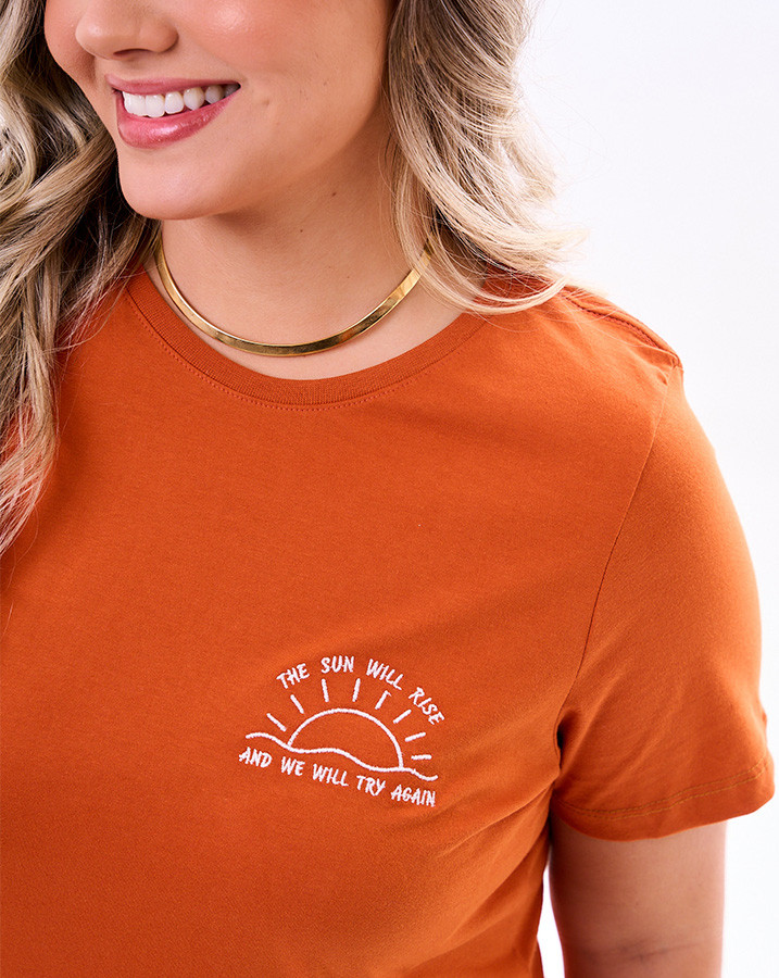 Camiseta Feminina Bordada Terracota Knulu: conforto, significado e design único em uma peça que eleva qualquer guarda-roupa.