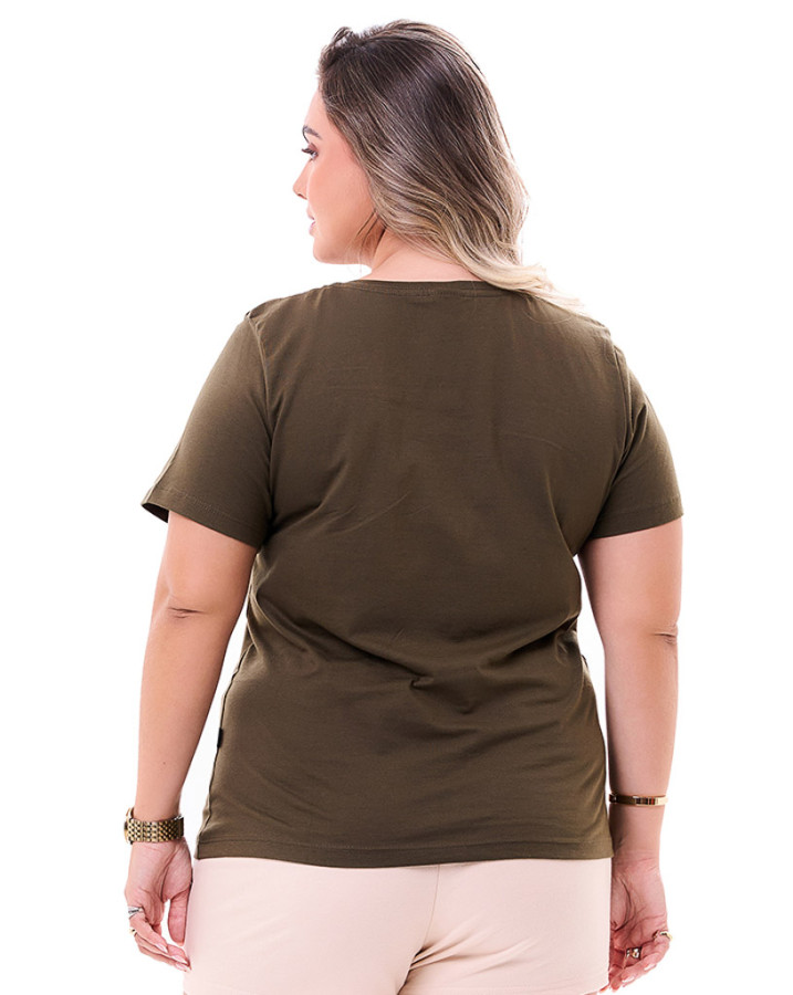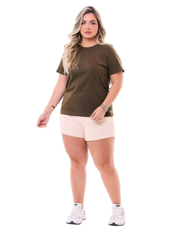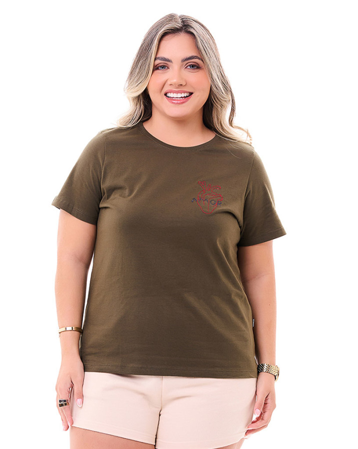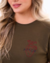 Camiseta Feminina Bordada Verde Musgo Knulu: Uma peça que combina design único e conforto em cada detalhe. Confeccionada em 100% algodão fio penteado 30.1, sua malha de alta qualidade com gramatura de 160 g/m² proporciona leveza, suavidade e um caimento impecável.