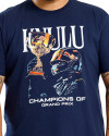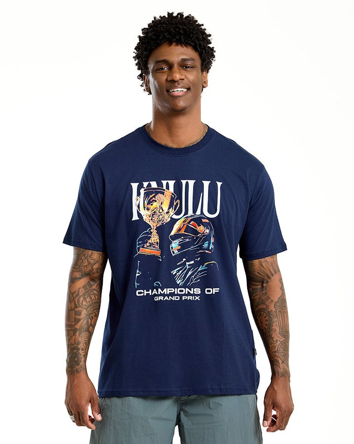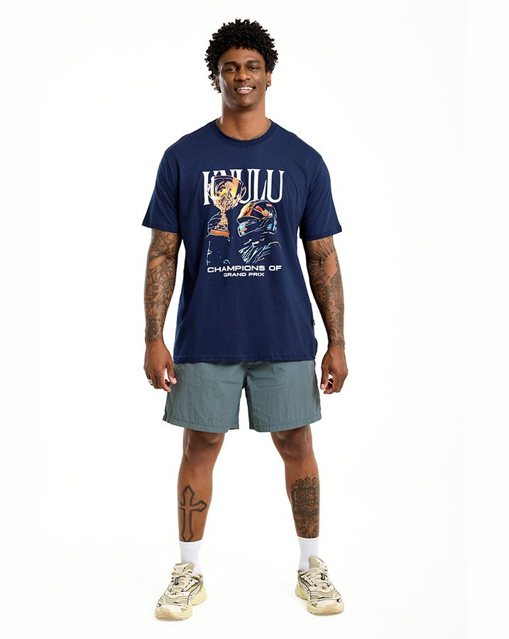 A Camiseta Classic Champions Marinho Knulu reforça a estética esportiva com uma estampa que simboliza a vitória nas pistas. O destaque vai para a arte em DTF no peito, com cores vibrantes e riqueza de detalhes que remetem ao universo automobilístico.