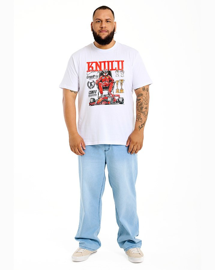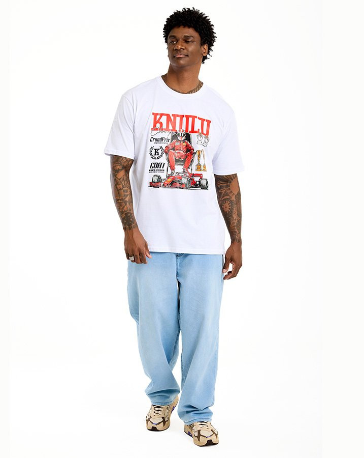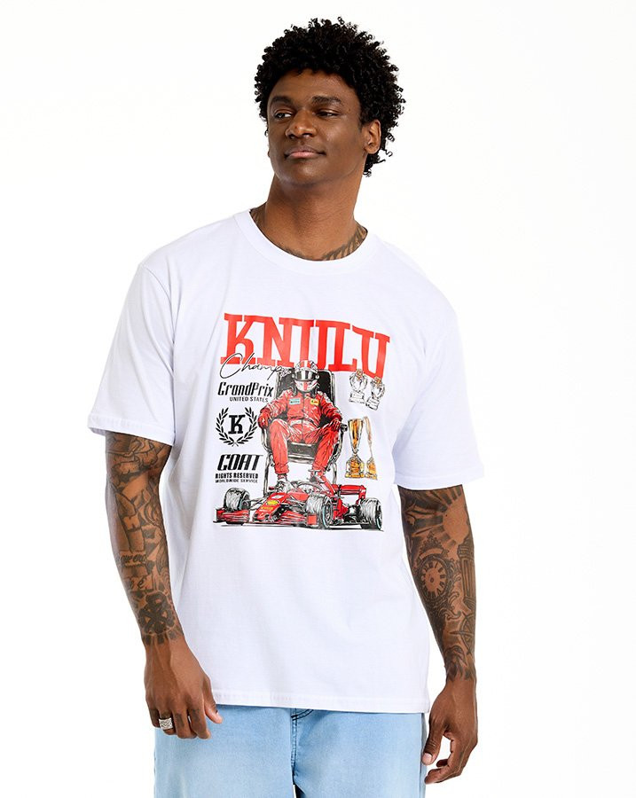 A Camiseta Classic Champs Branco Knulu combina o lifestyle das pistas com o visual urbano. Com estampa em DTF de alta definição, a peça traz uma ilustração inspirada no universo do automobilismo, destacando um piloto em posição de vitória ao lado de troféus e marcas exclusivas da Knulu.
