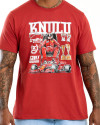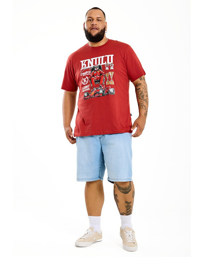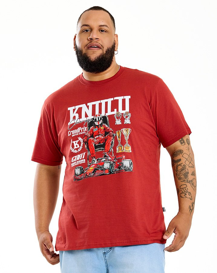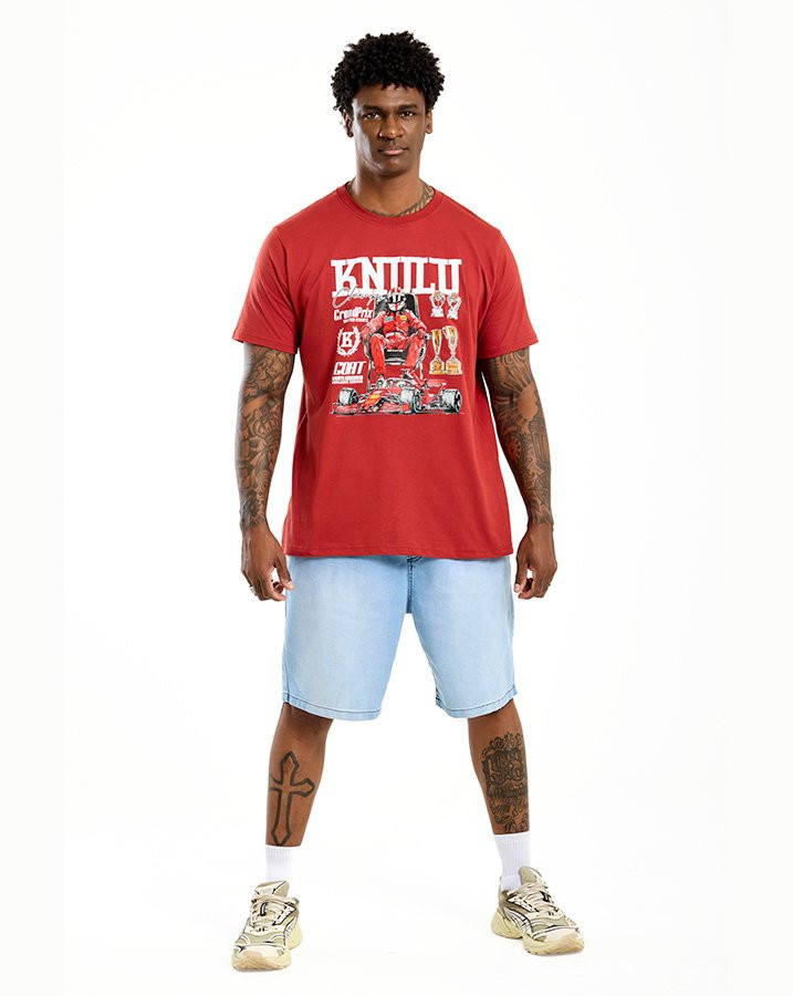 Camiseta Classic Champs Vermelho Queimado Knulu Knulu combina o lifestyle das pistas com o visual urbano. Com estampa em DTF de alta definição, a peça traz uma ilustração inspirada no universo do automobilismo, destacando um piloto em posição de vitória ao lado de troféus e marcas exclusivas da Knulu.