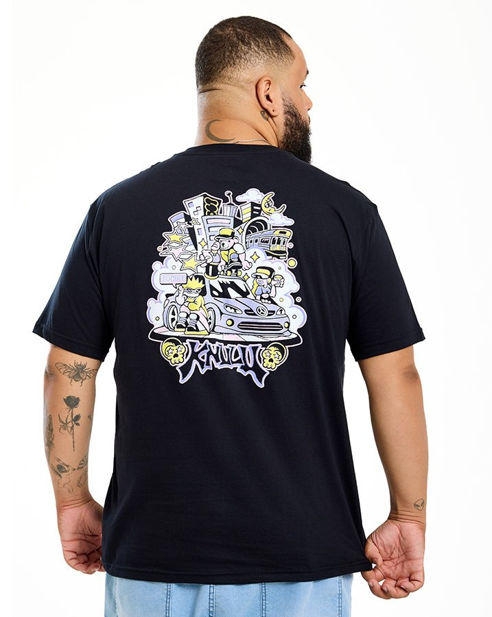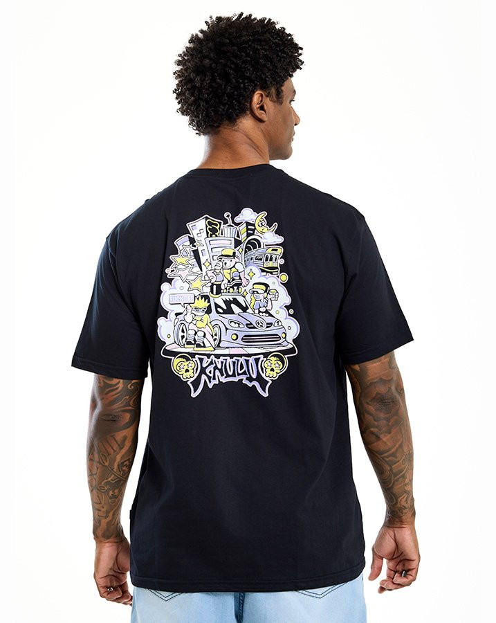 A estampa nas costas é o grande destaque, trazendo elementos de cidade, carros e personagens no estilo gráfico da Knulu — resultando em uma peça criativa e cheia de personalidade.