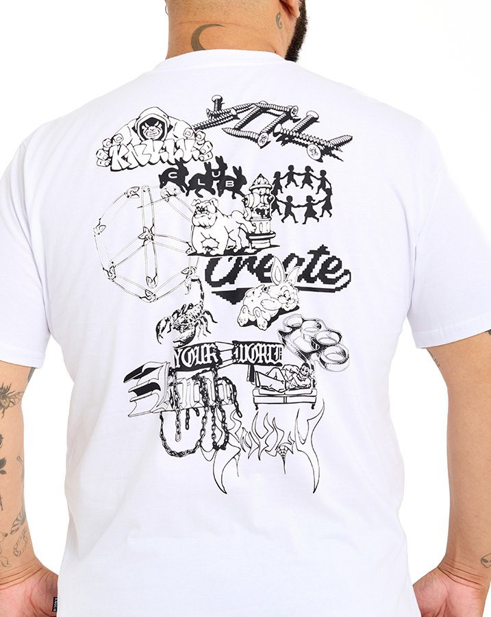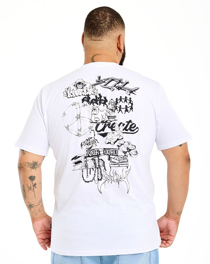 A Camiseta Classic Create Your World Knulu traduz a essência criativa e urbana da marca. Com arte exclusiva estampada em silk screen nas costas, ela propõe uma jornada visual por elementos que remetem à liberdade de expressão e construção de identidade.