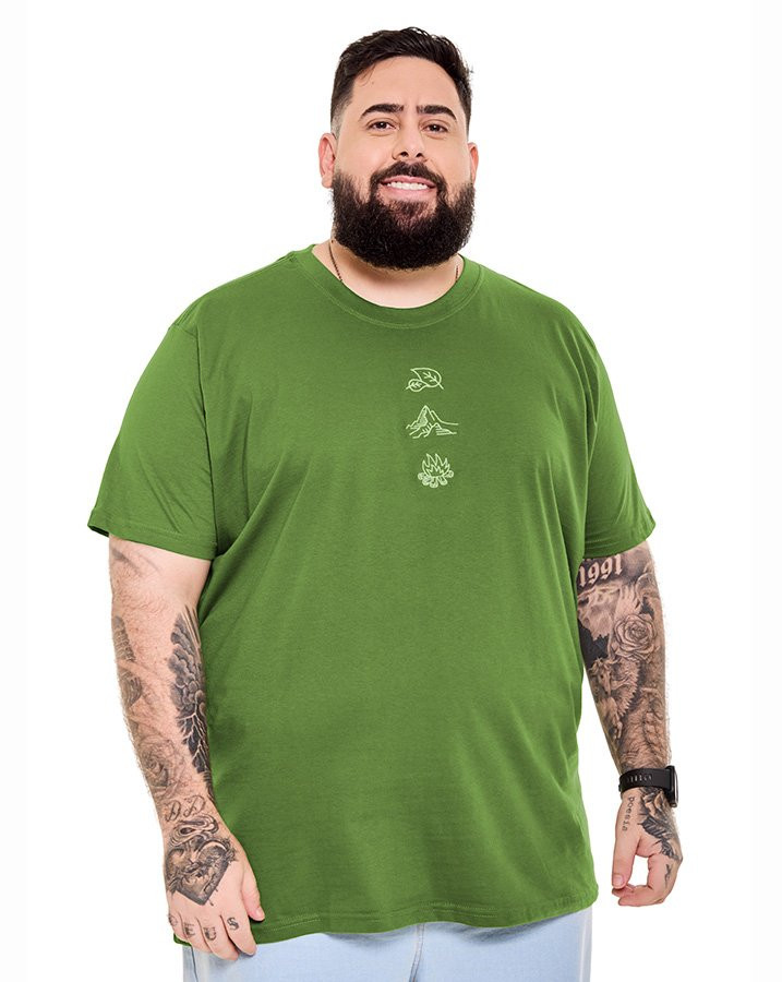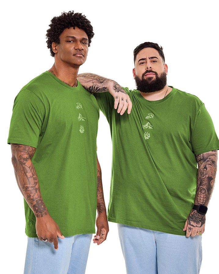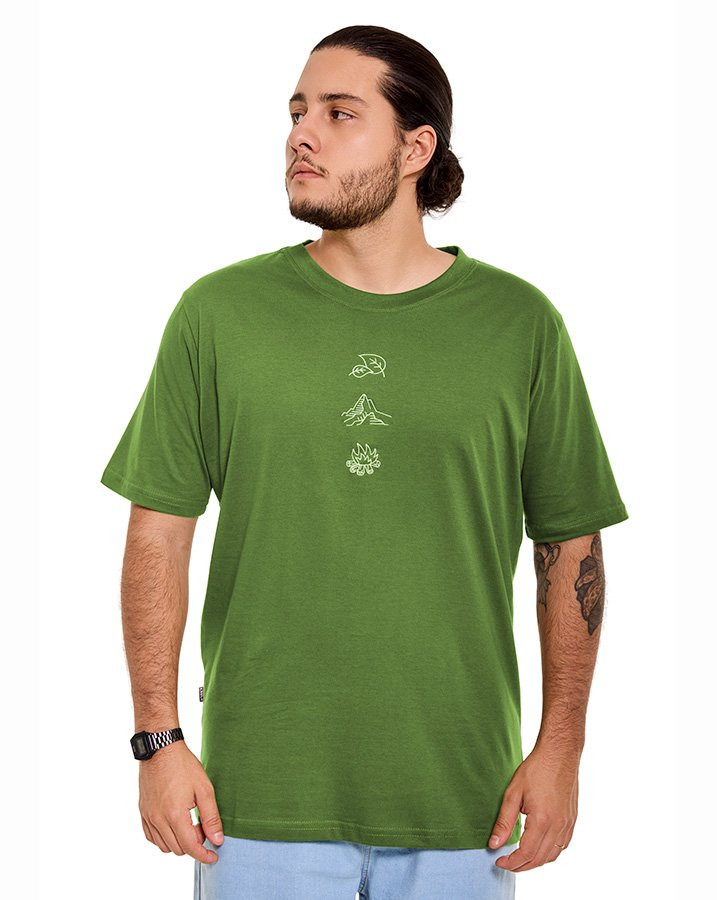 A Camiseta Classic Mountain Icons Verde Knulu combina simplicidade e propósito em um visual com identidade outdoor. A tonalidade verde reforça a conexão com a natureza, enquanto o bordado centralizado representa três ícones da vida ao ar livre: folha, montanha e fogo.