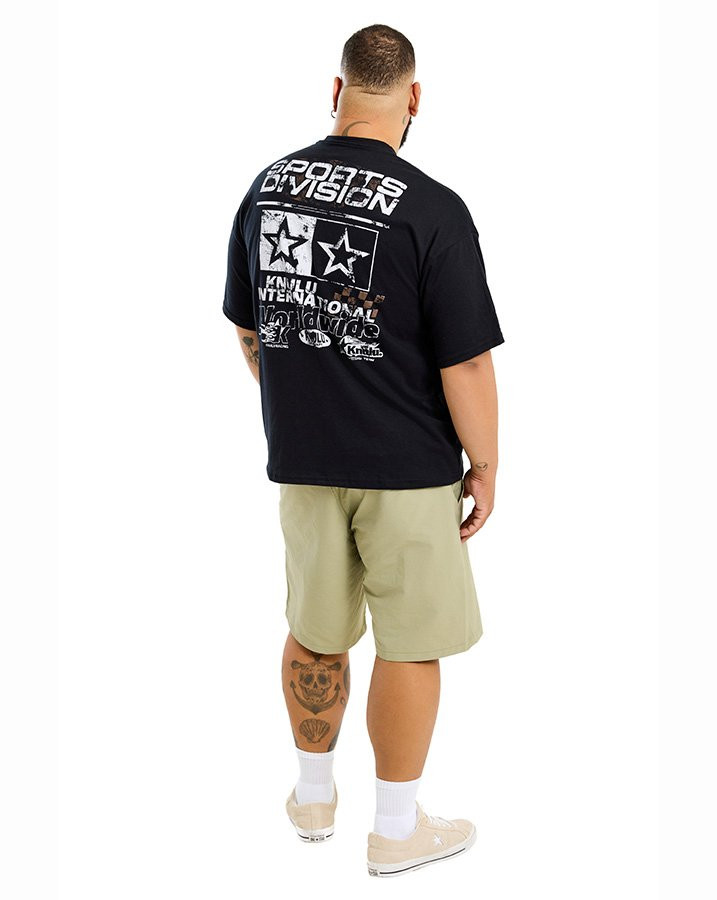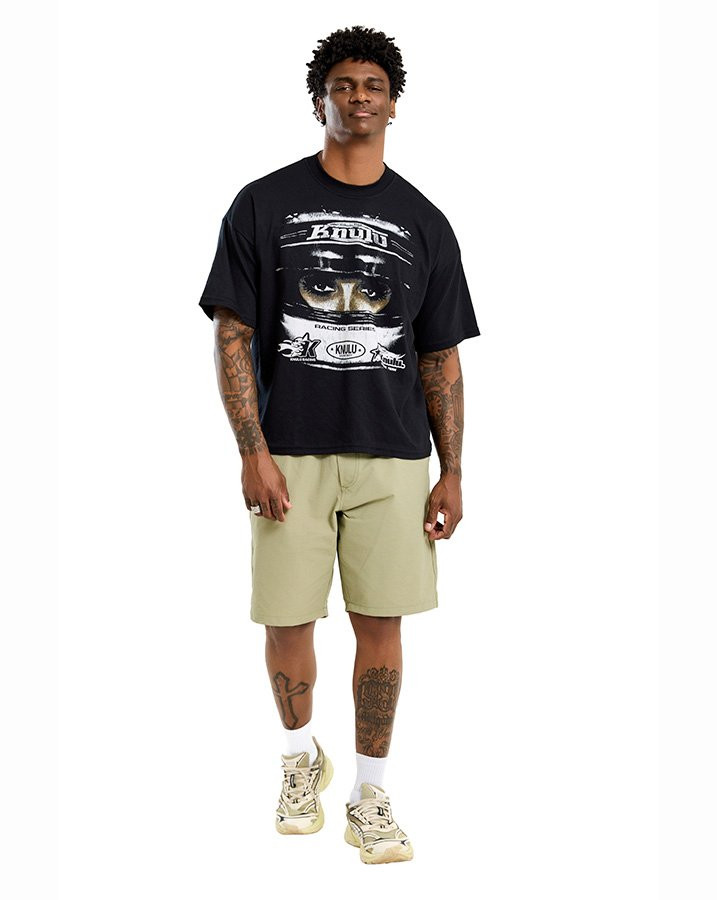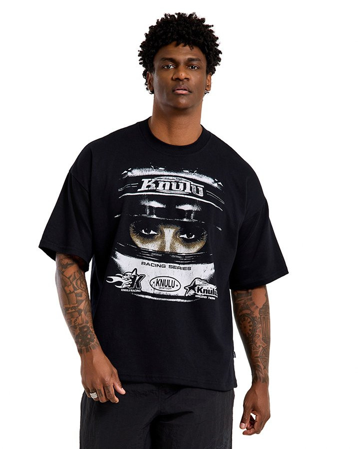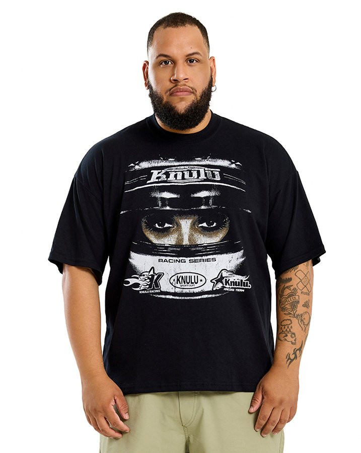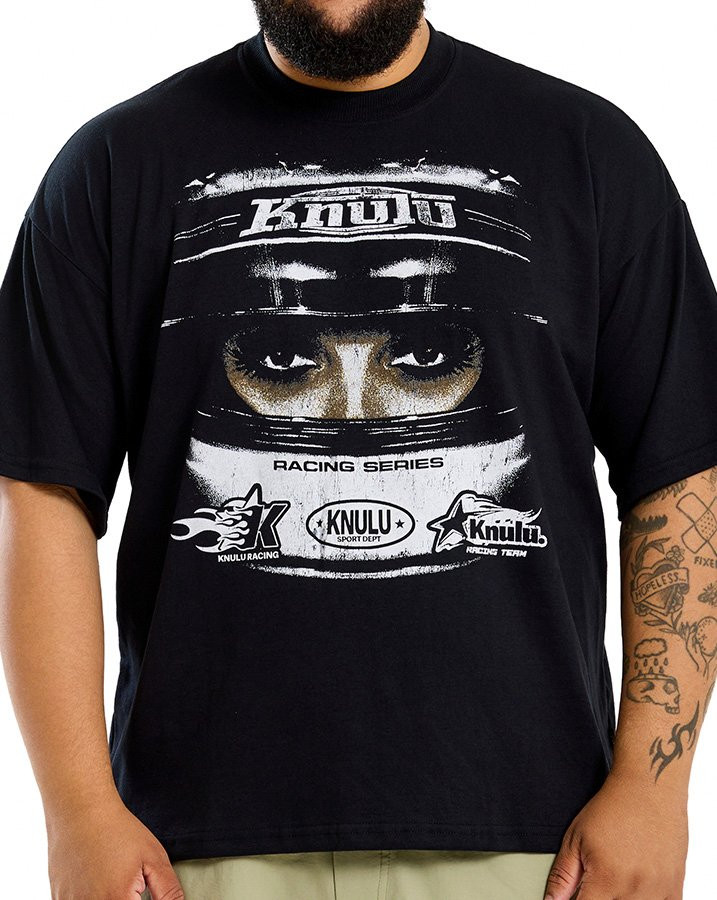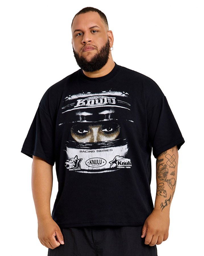 A Camiseta Oversized Boxy Racing Preto Knulu traz a estética das pistas direto para o streetwear. Com modelagem ampla e caimento estruturado, ela reforça presença sem abrir mão do conforto.