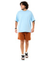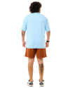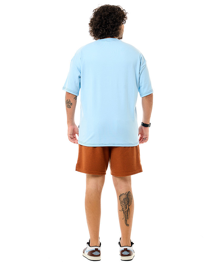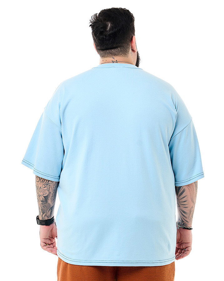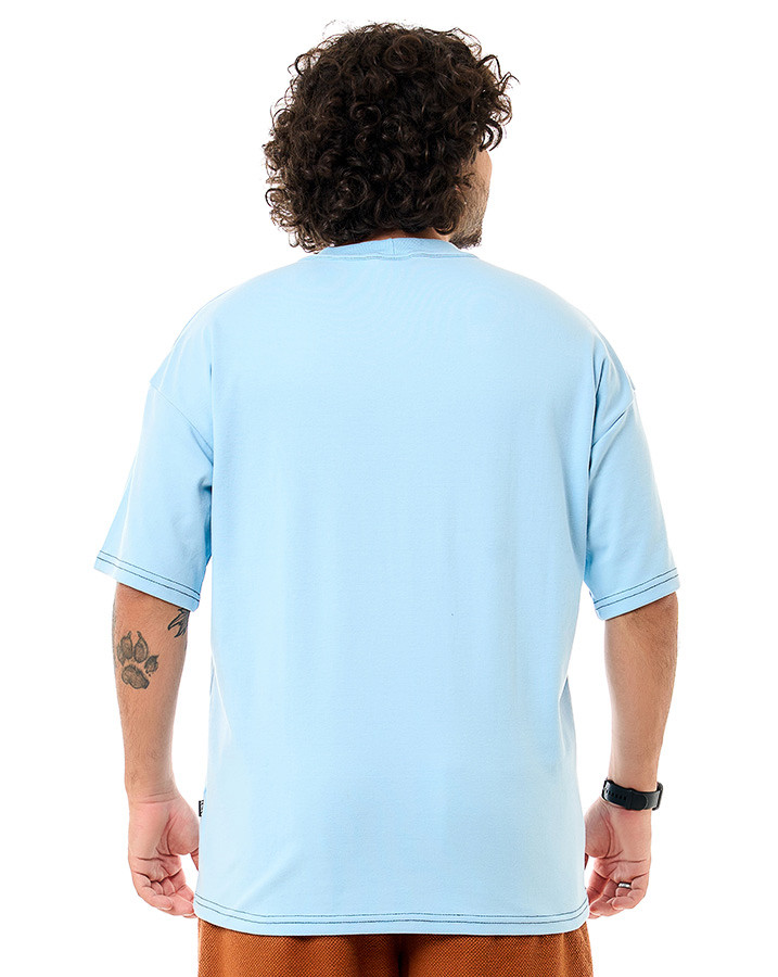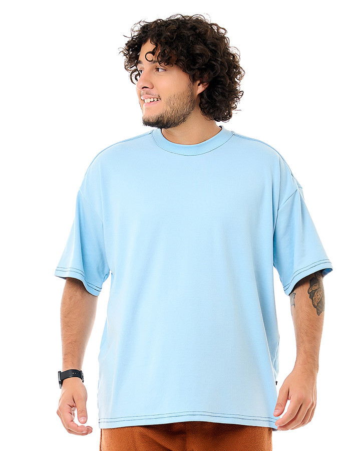 Na delicada cor azul bebê, a camiseta destaca-se pelas costuras contrastantes em branco na gola, mangas, ombros e barra, adicionando um toque de sofisticação ao design clean. A modelagem oversized com corte amplo e mangas largas garante conforto e um visual contemporâneo, perfeito para quem busca looks modernos e cheios de identidade.