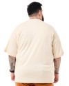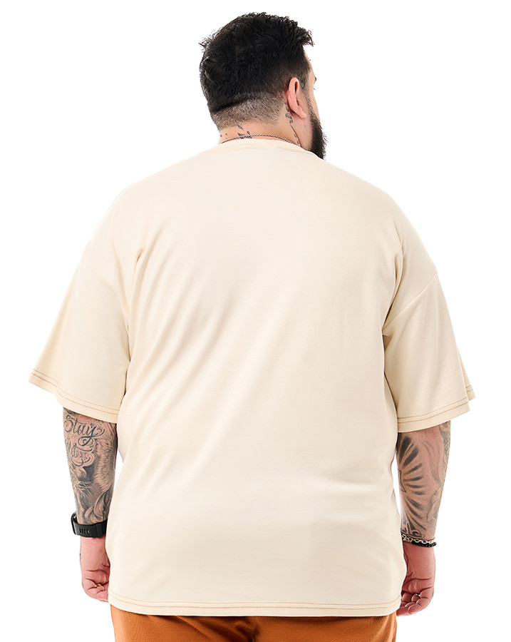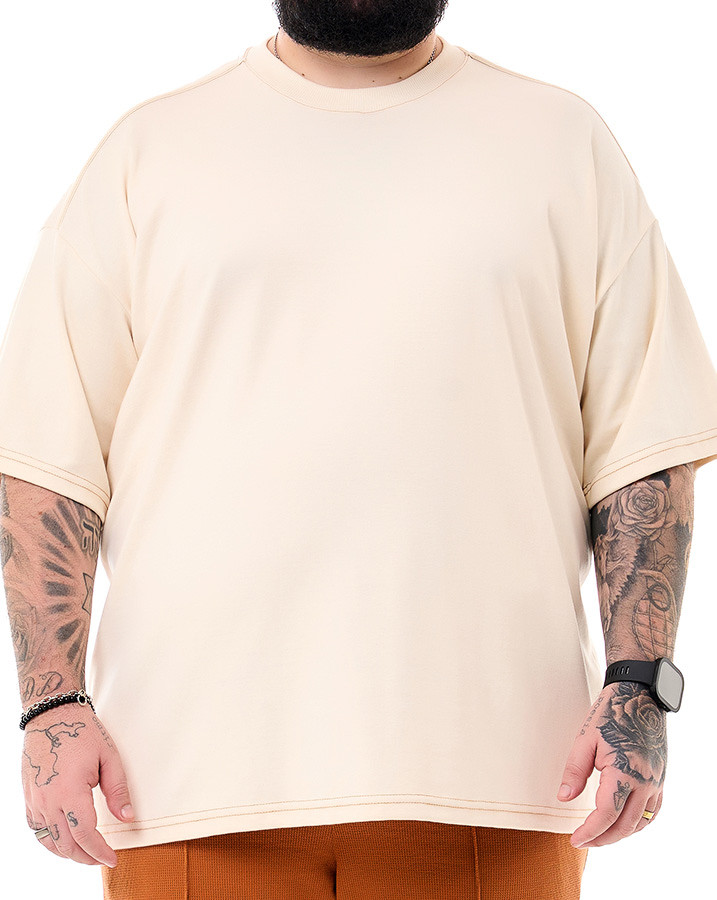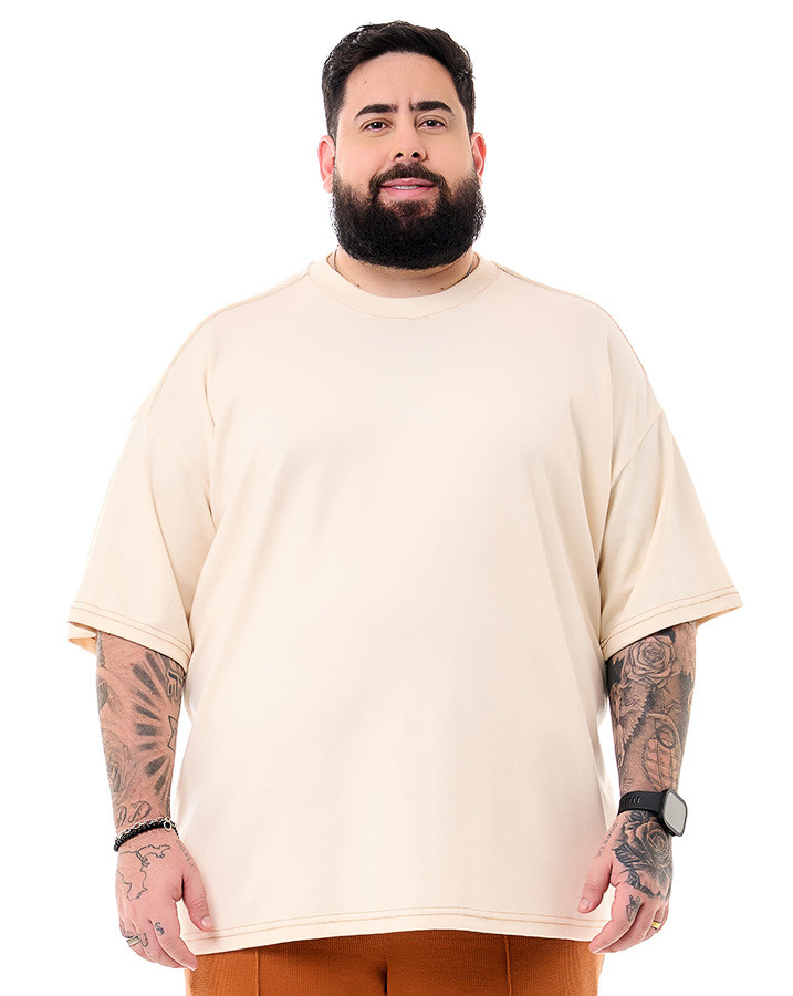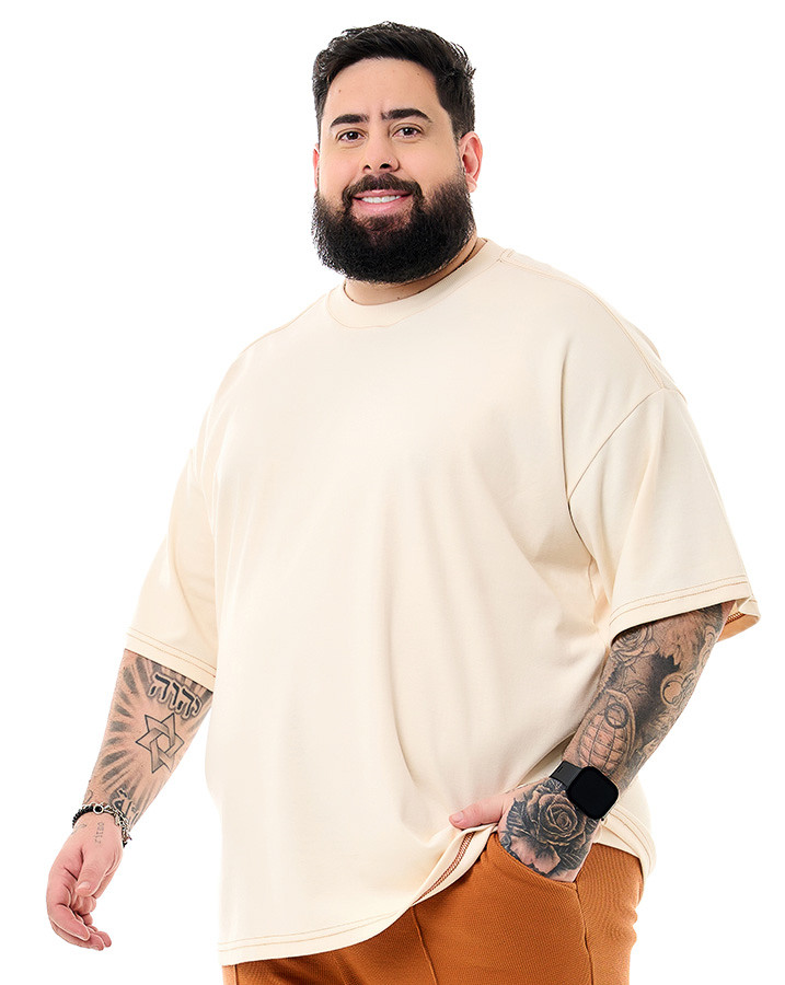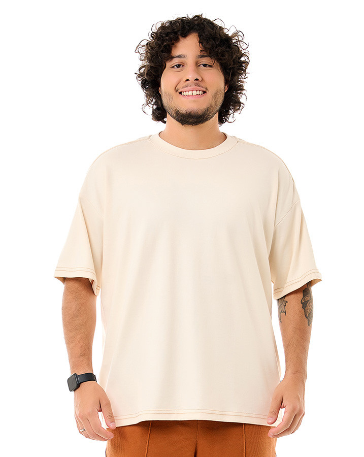 Na cor off white, a camiseta se destaca pelas costuras contrastantes em preto na gola, mangas, ombros e barra, adicionando um toque de sofisticação ao design clean. Sua modelagem oversized com corte amplo, mangas largas e comprimento alongado garante conforto e um visual contemporâneo, ideal para quem busca looks modernos e cheios de identidade.