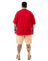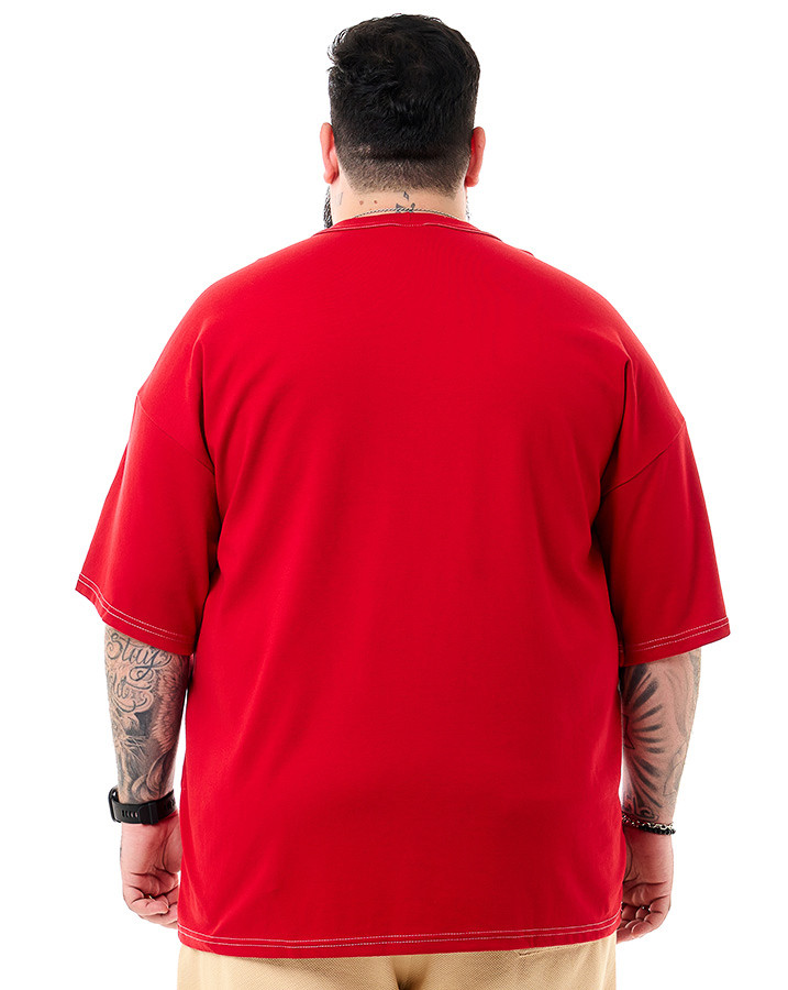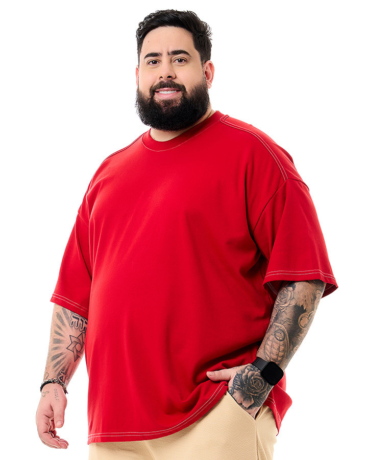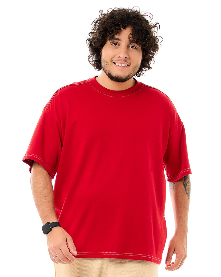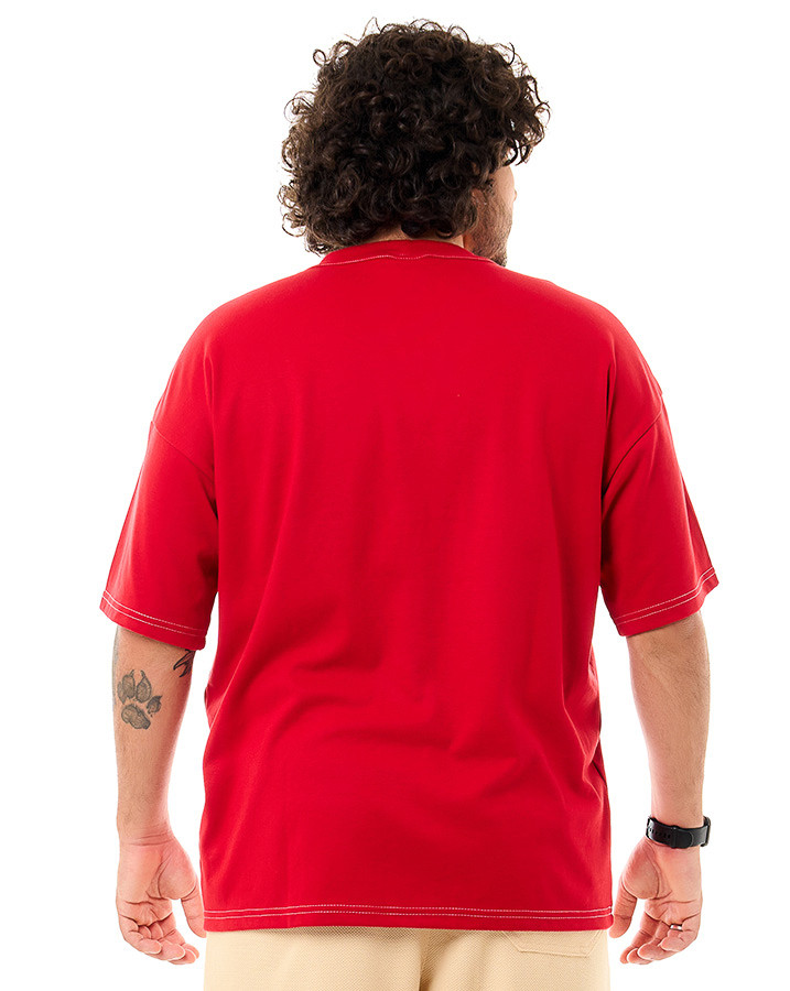 Na vibrante cor vermelha, a camiseta destaca-se pelas costuras contrastantes em branco na gola, mangas, ombros e barra, adicionando sofisticação ao design clean. A modelagem oversized, com corte amplo e mangas largas, garante conforto e um visual contemporâneo, ideal para quem deseja expressar identidade em seus looks.