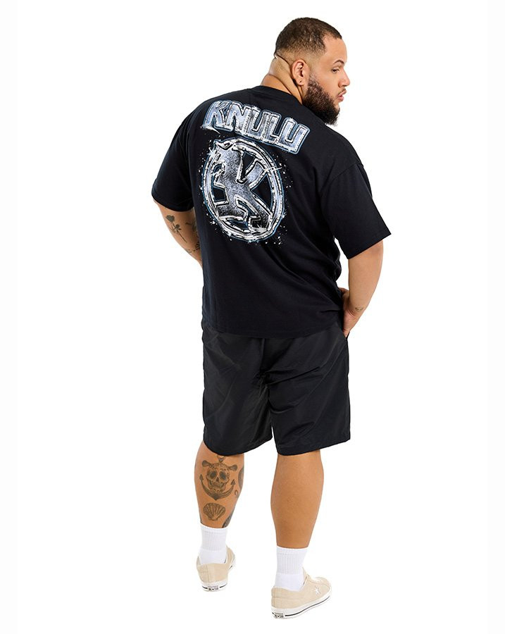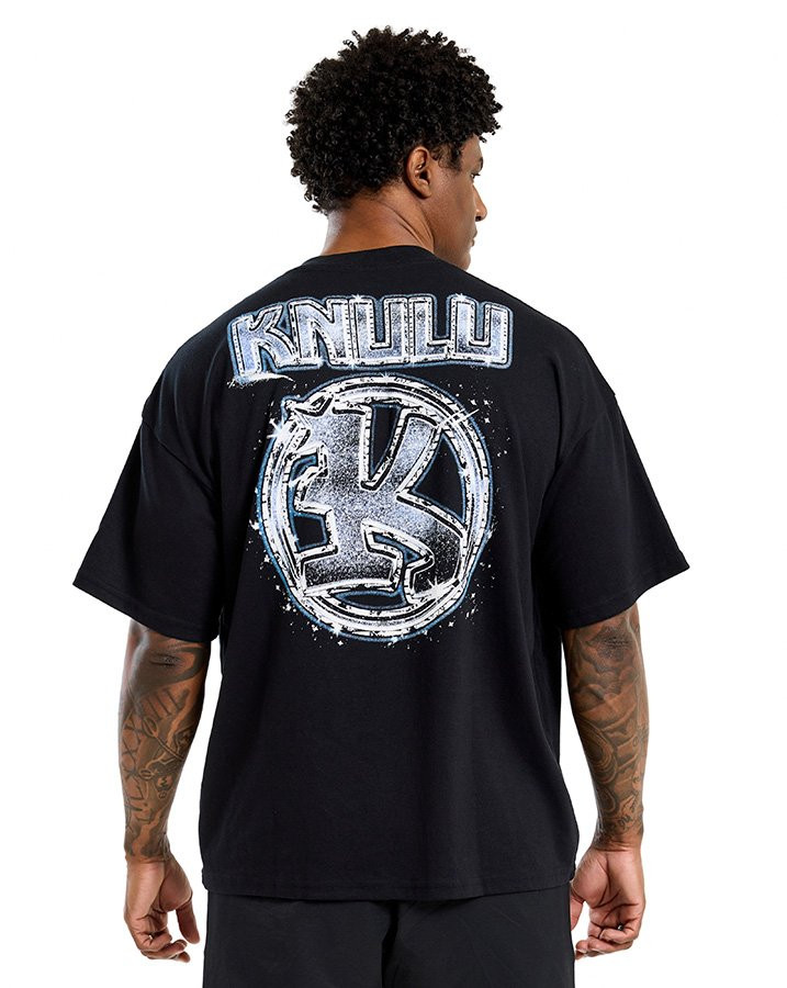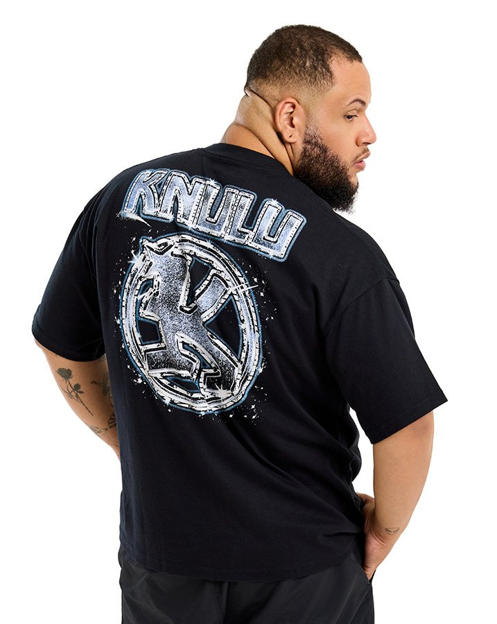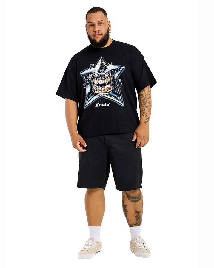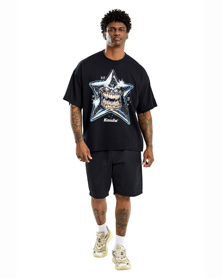 A estampa frontal em silk traz uma estrela intensa com expressão agressiva e caótica. Nas costas, o logotipo Knulu ganha destaque em visual gráfico, com acabamento que simula desgaste urbano e street.