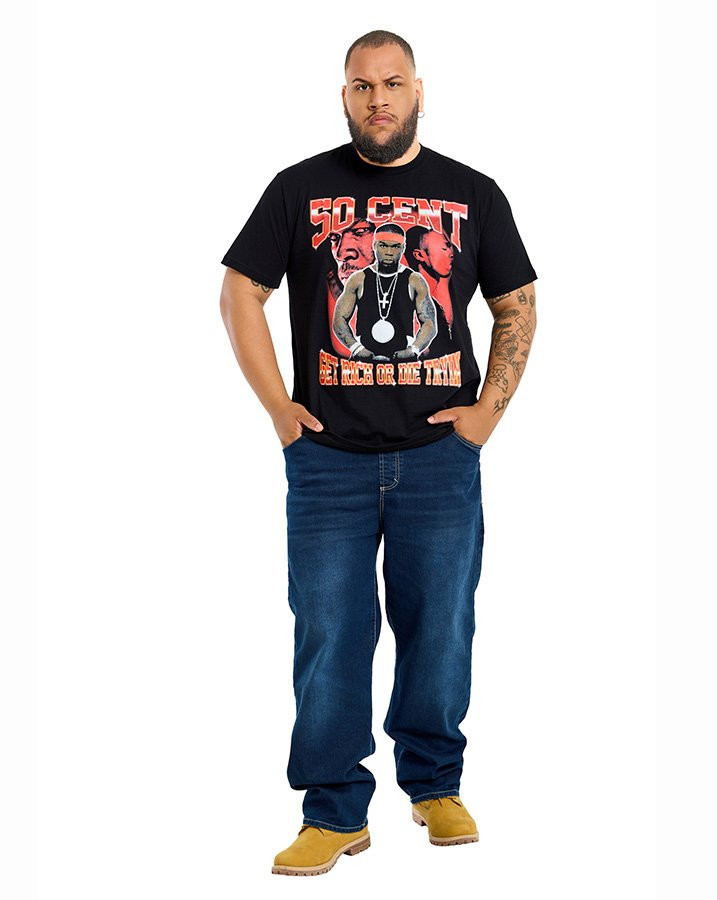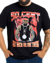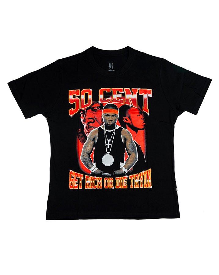 A Camiseta Classic 50 Cent Preto Knulu estampa um dos maiores nomes do rap mundial com arte inspirada no álbum icônico “Get Rich or Die Tryin’”. A composição gráfica mistura diferentes ângulos do artista com cores em contraste e letras marcantes, transmitindo atitude e presença visual.
