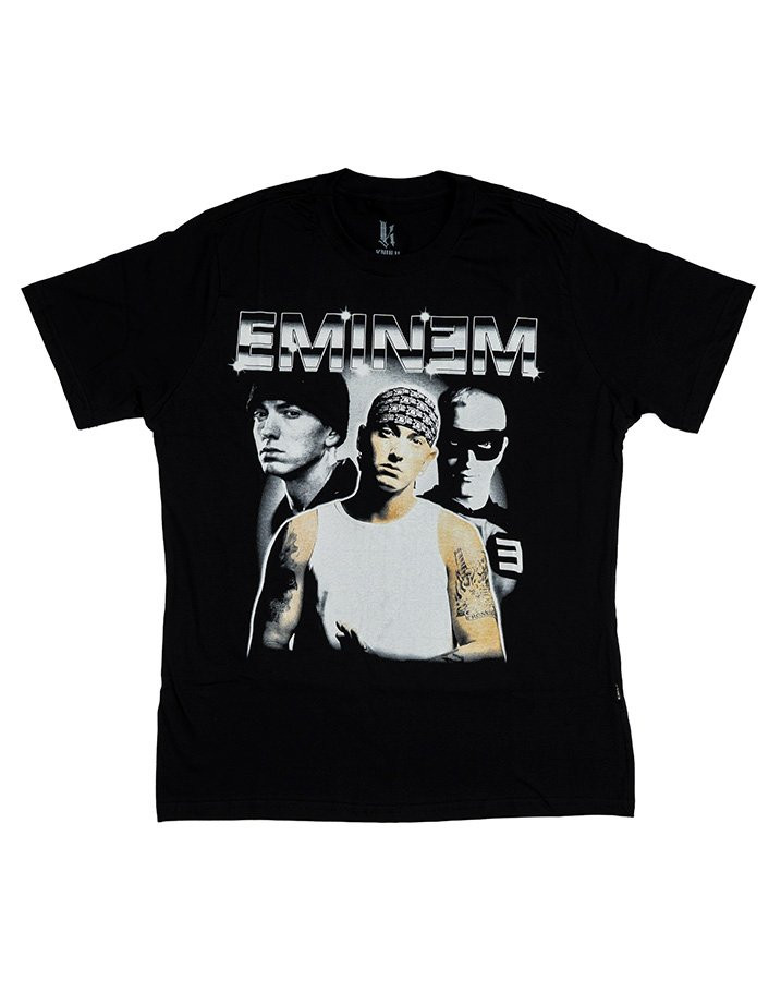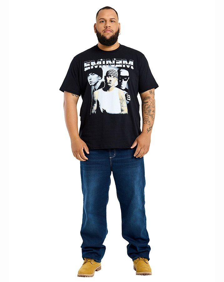 A Camiseta Classic Eminem Preto Knulu apresenta uma arte frontal com três versões visuais do artista em diferentes momentos da carreira, destacando seu impacto cultural no rap. Com estética marcada por tons de preto, branco e cinza, a estampa traz contraste e presença gráfica com referência direta à identidade visual de Eminem.