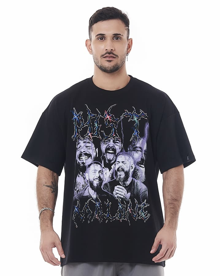 O corte oversized proporciona um visual moderno e liberdade de movimento, enquanto a gola careca a torna versátil. A estampa exclusiva, inspirada no Post Malone, adiciona autenticidade ao estilo.