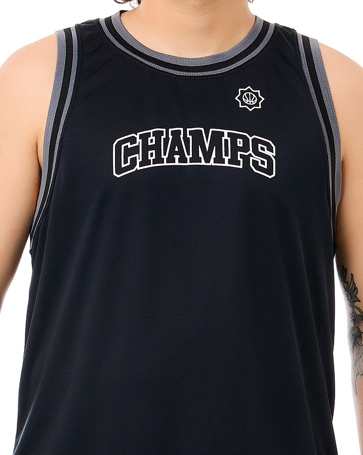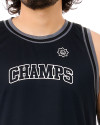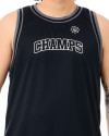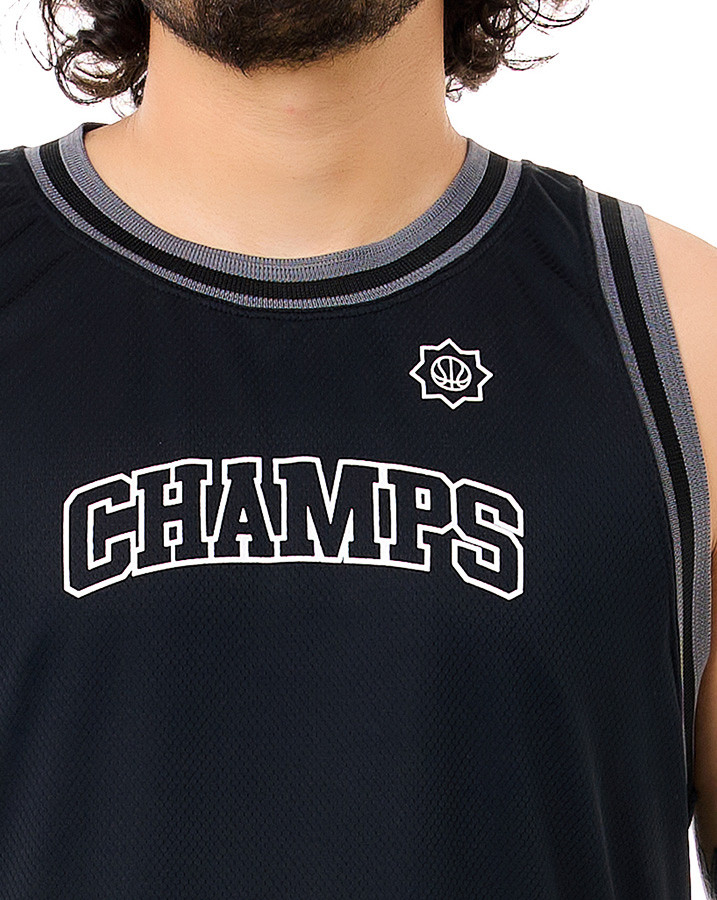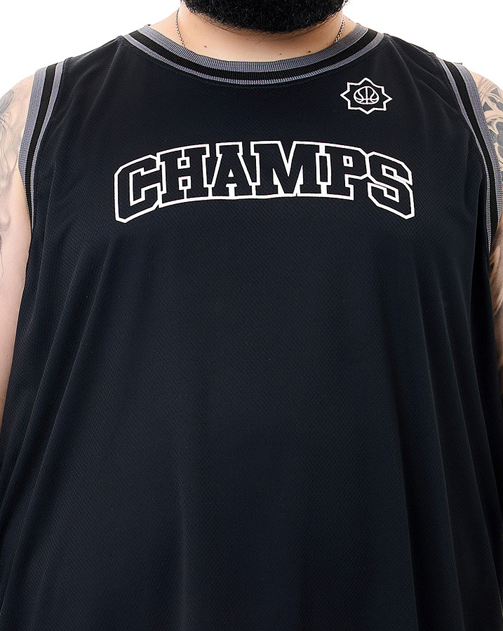 A estampa frontal com a palavra "CHAMPS" em branco com bordas pretas destaca o visual esportivo da peça. O logo minimalista no lado superior esquerdo, com uma estrela estilizada envolvendo uma bola de basquete, adiciona um toque de exclusividade e modernidade. A etiqueta na barra, próxima à parte inferior, reforça a autenticidade da marca.