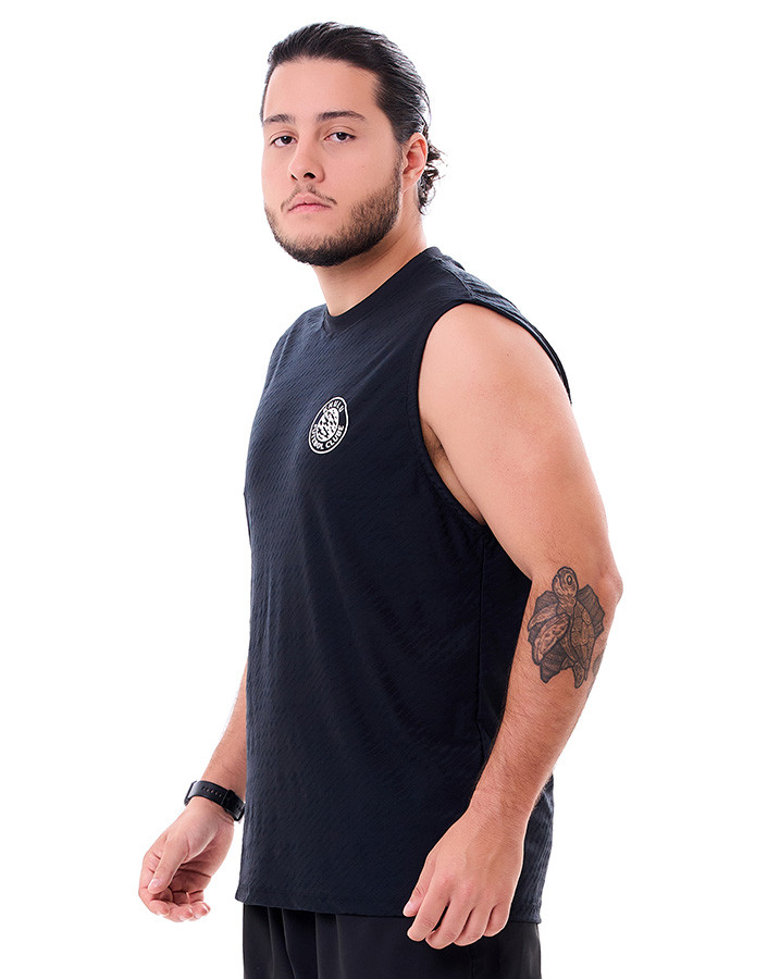 O tecido jacquard texturizado, com um padrão geométrico discreto de pequenos losangos diagonais, adiciona um toque de sofisticação sutil, tornando cada detalhe uma expressão de cuidado e precisão. A modelagem muscle tee, com cavas amplas e caimento fluido, oferece liberdade de movimento e um visual moderno que transita entre o casual e o esportivo.