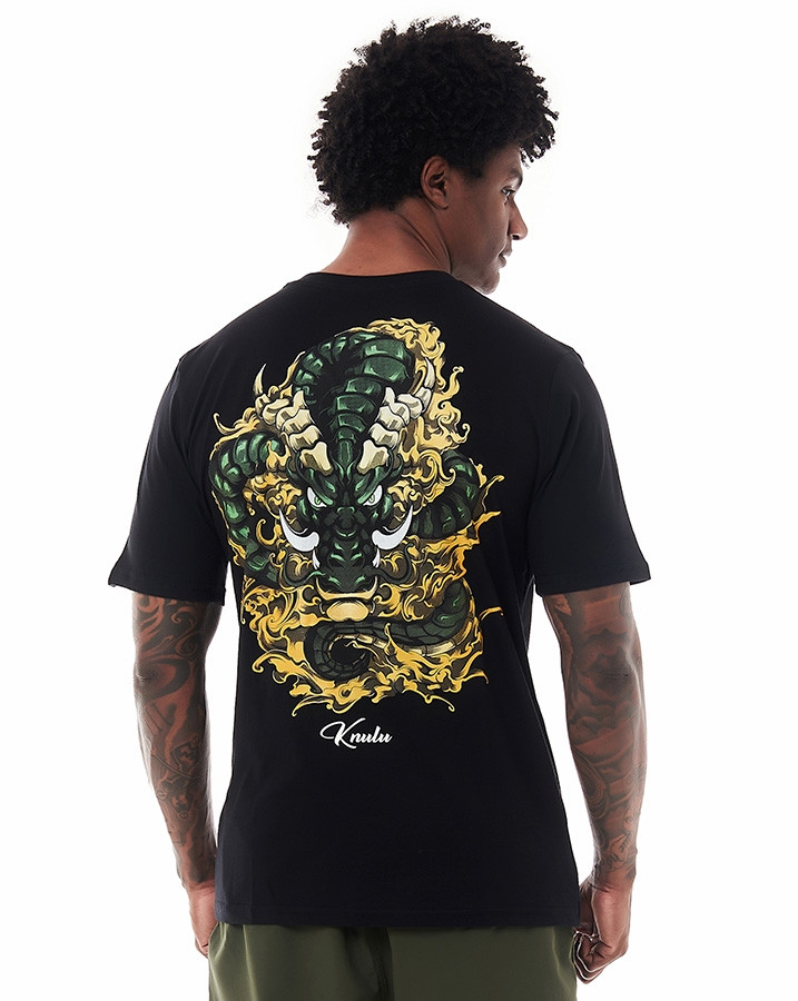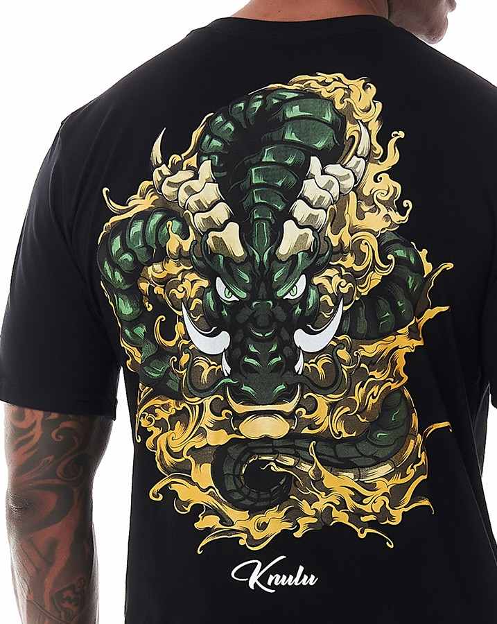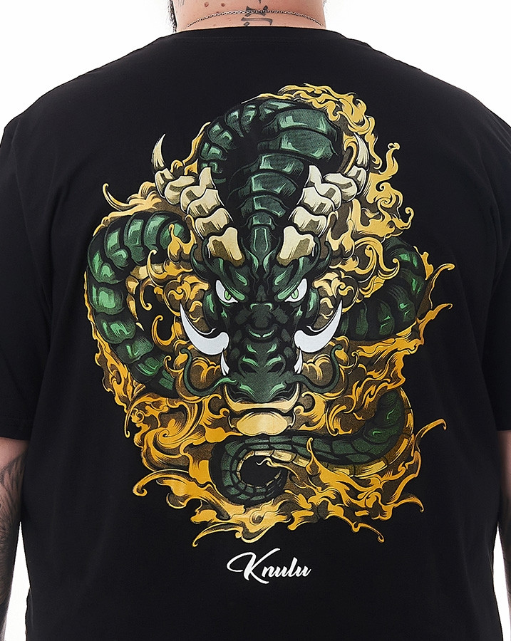 A Camiseta Classic Dragon Preto Knulu foi produzida em malha premium, sendo pensada desde o início do processo dos fios de alta qualidade, modelagem tradicional, gola careca e mangas curtas.