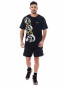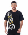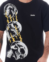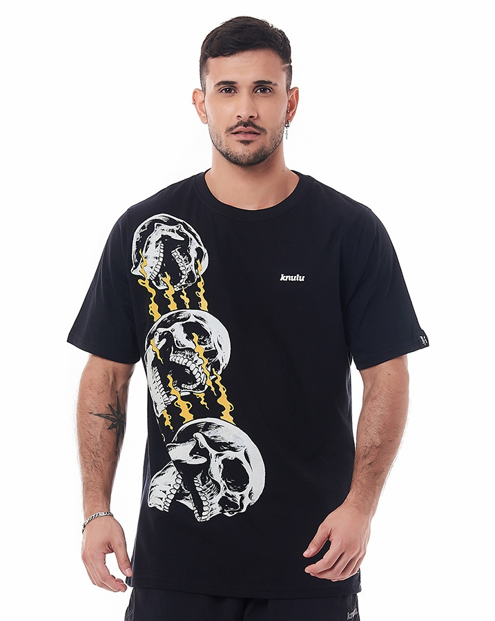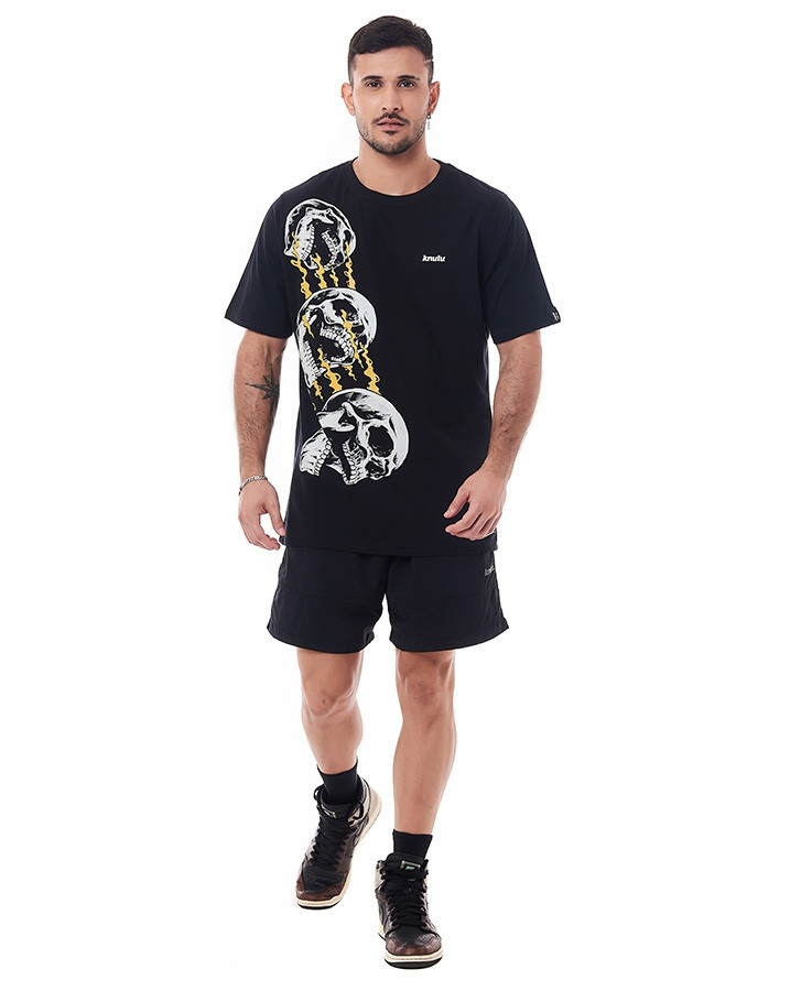 Seu corte tradicional proporciona um caimento perfeito, enquanto a gola careca e a manga curta tradicional conferem um visual clássico e versátil. O destaque desta camiseta é o seu silk exclusivo, apresentando uma impactante estampa com três caveiras na parte da frente.