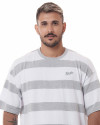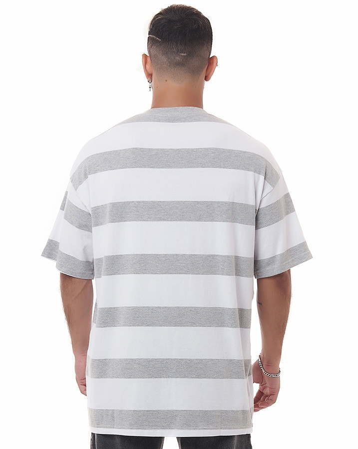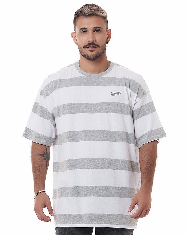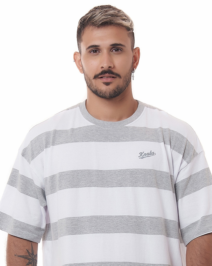Desperte seu estilo com a Camiseta Listrada Oversized Grey Line Branco da Knulu! A modelagem ampla traz um visual despojado e moderno, enquanto o tecido de alta qualidade (96% Algodão e 4% elastano) proporciona toque suave e flexibilidade.