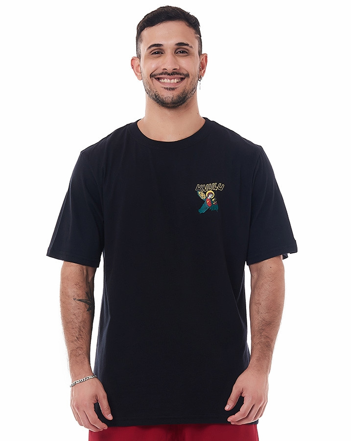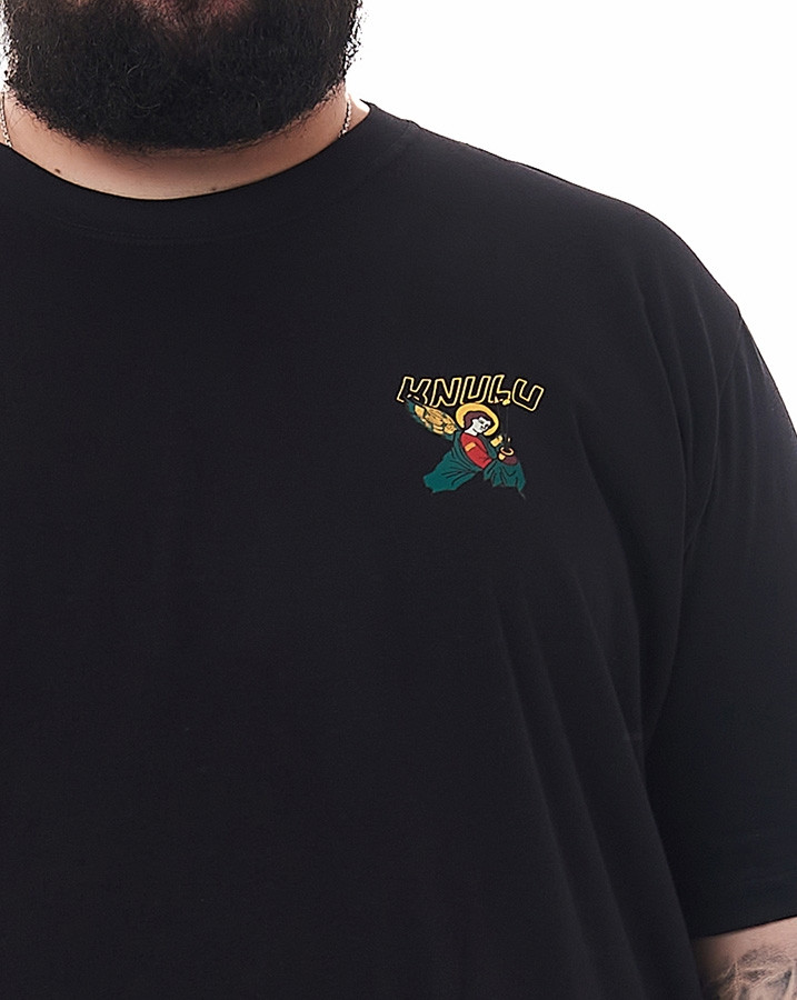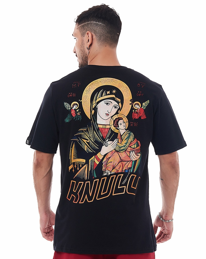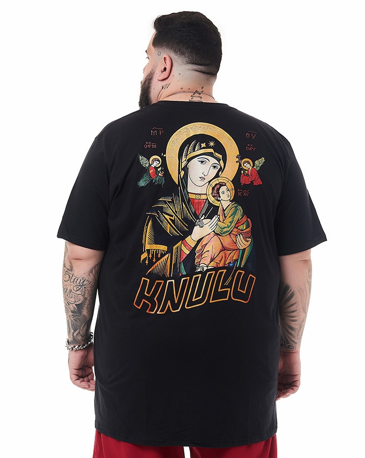 A parte frontal desta camiseta traz uma estampa discreta, localizada no lado esquerdo do peito, com a palavra "Knulu" acompanhada por uma pequena imagem de nossa senhora do perpétuo socorro. Uma forma sutil de carregar sua fé consigo, sempre perto do coração.