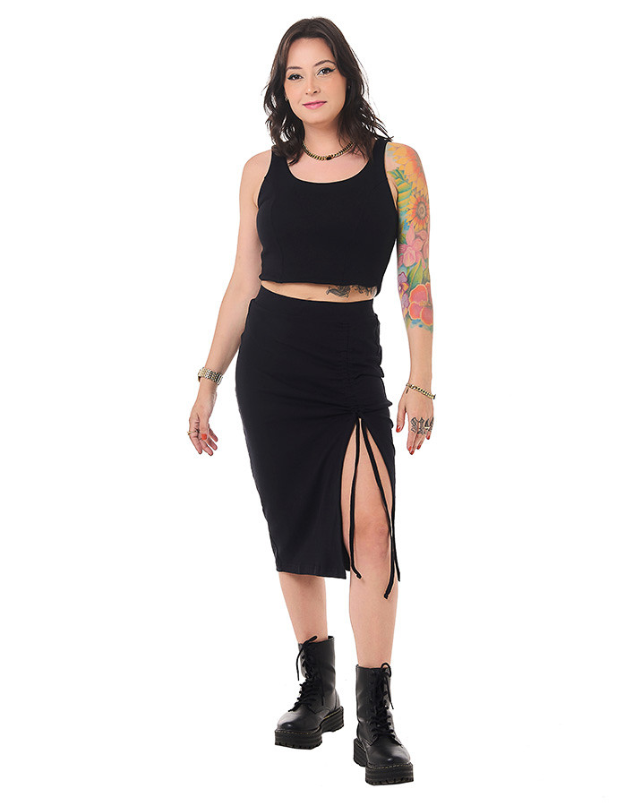 O grande diferencial da Saia Midi Canelada Regulagem é a fenda com regulagem na perna esquerda. Essa característica inovadora dá a você o poder de escolher a altura desejada para a fenda, proporcionando versatilidade ao seu look. Seja para um evento mais formal ou uma ocasião descontraída, adapte a saia conforme a atmosfera do momento.