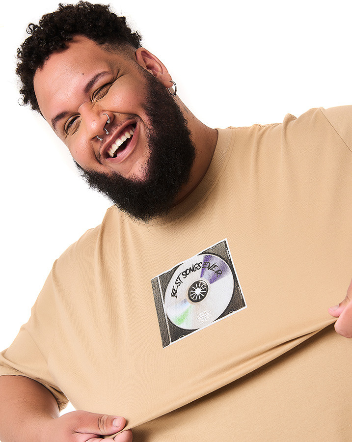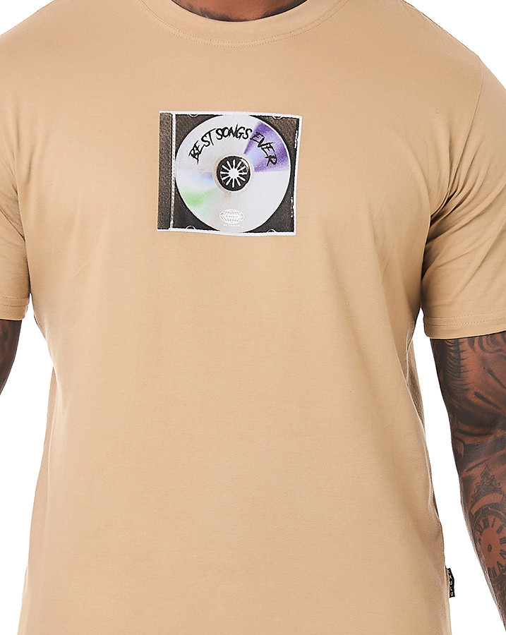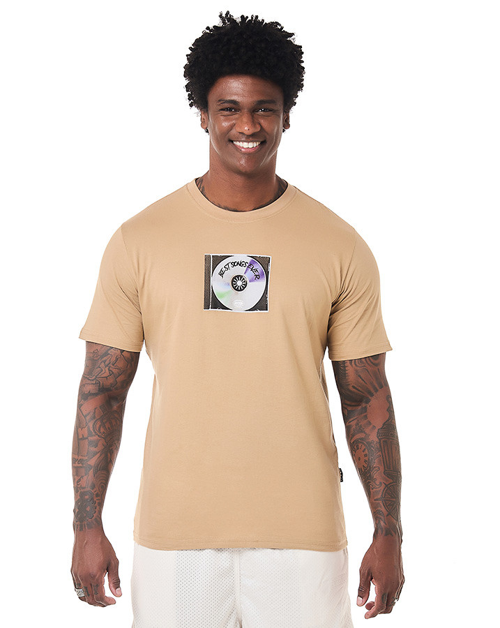 Com um corte tradicional que proporciona um ajuste perfeito, esta camiseta apresenta uma estampa única em silk screen na frente. Um CD dentro de uma capa é o destaque, com a frase "best songs ever" escrita, que significa "melhores músicas de todos os tempos", expressando o amor pela música e suas melodias atemporais.