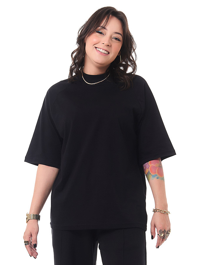 O corte oversized e a manga raglan proporciona um caimento moderno e descolado, garantindo liberdade de movimento e um visual urbano único. Além disso, o destaque fica por conta da gola alta, que confere um toque de sofisticação e personalidade à camiseta.