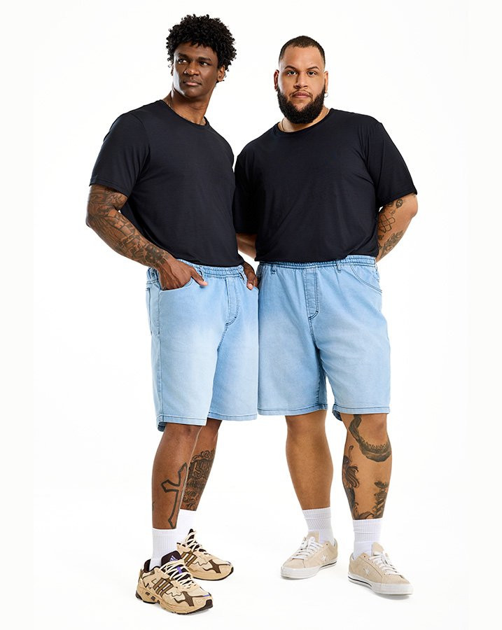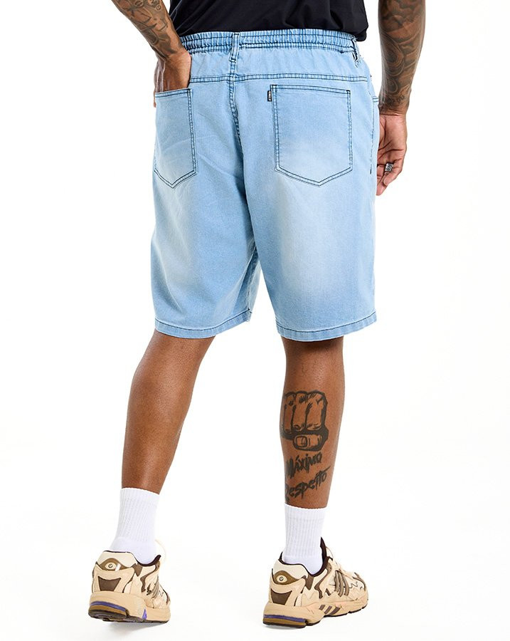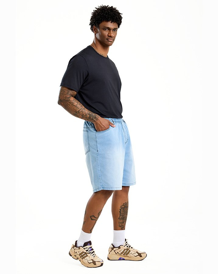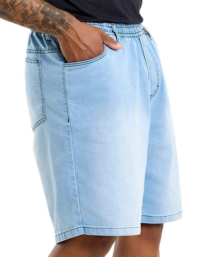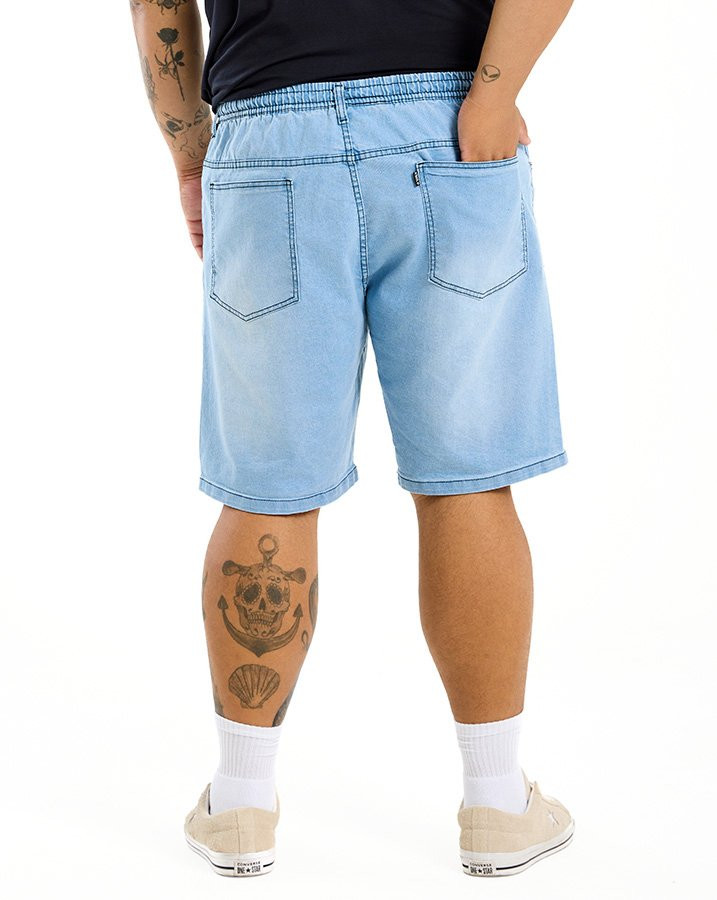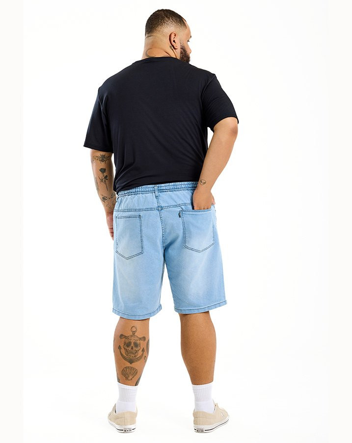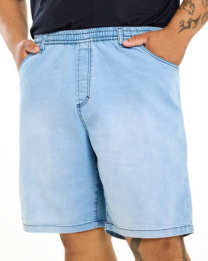Bermuda jeans azul clara com cintura elástica e bolsos funcionais. Leve, confortável e estilosa para o dia a dia.