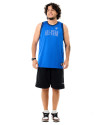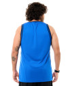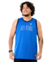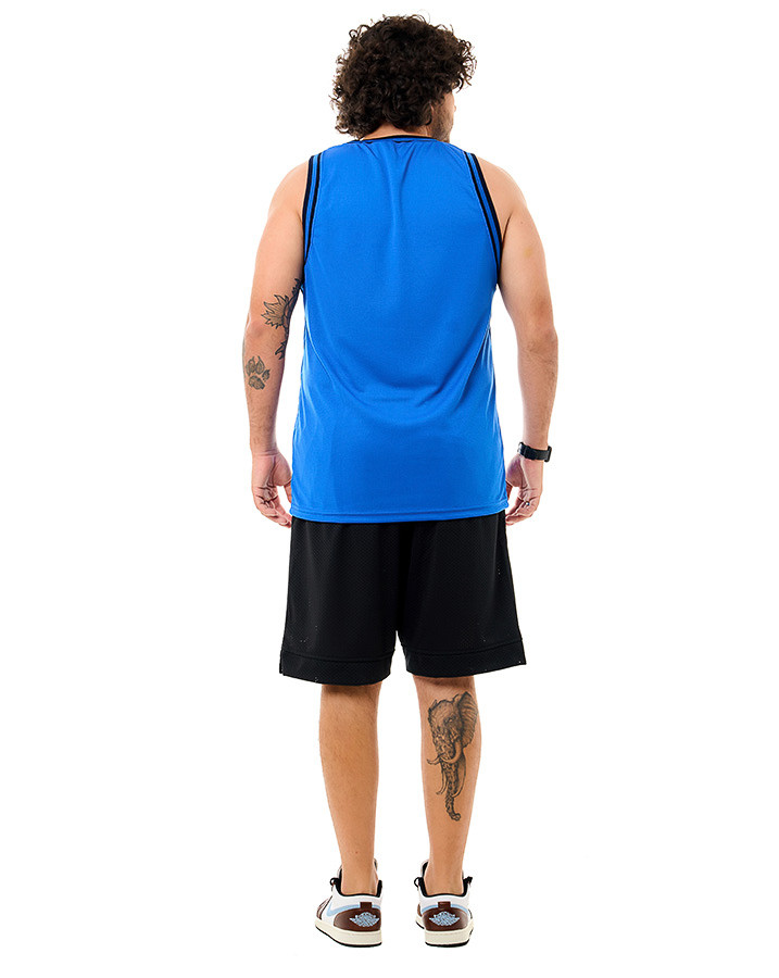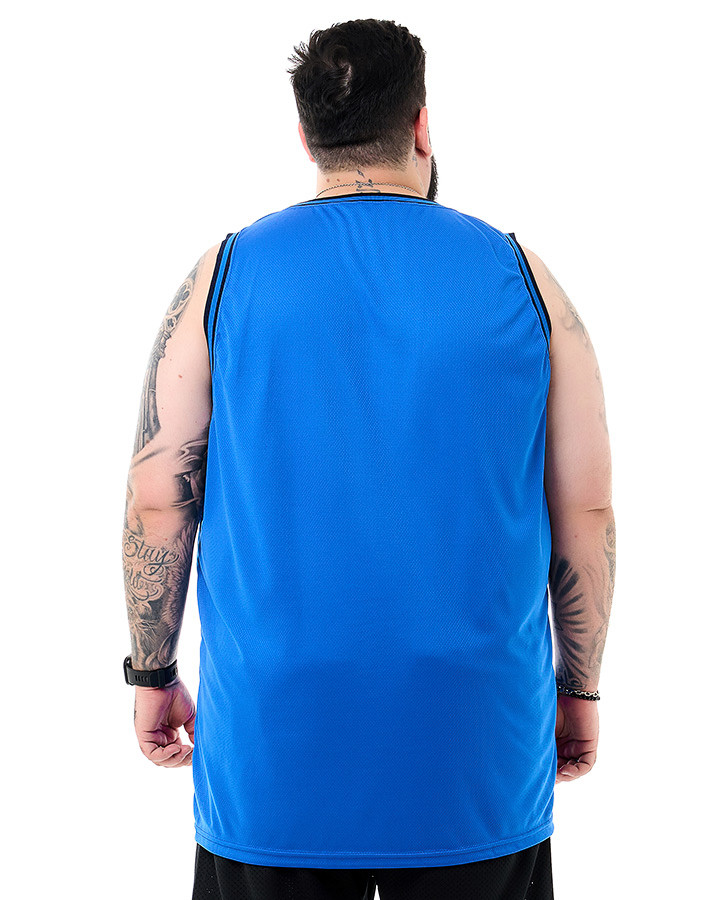 O logo discreto no lado superior direito, que combina uma bola de basquete com linhas dinâmicas, reforça a estética esportiva e contemporânea da regata. As alças e a gola apresentam acabamento em retilínea nas cores preta e azul, criando um contraste elegante e um toque refinado ao visual.