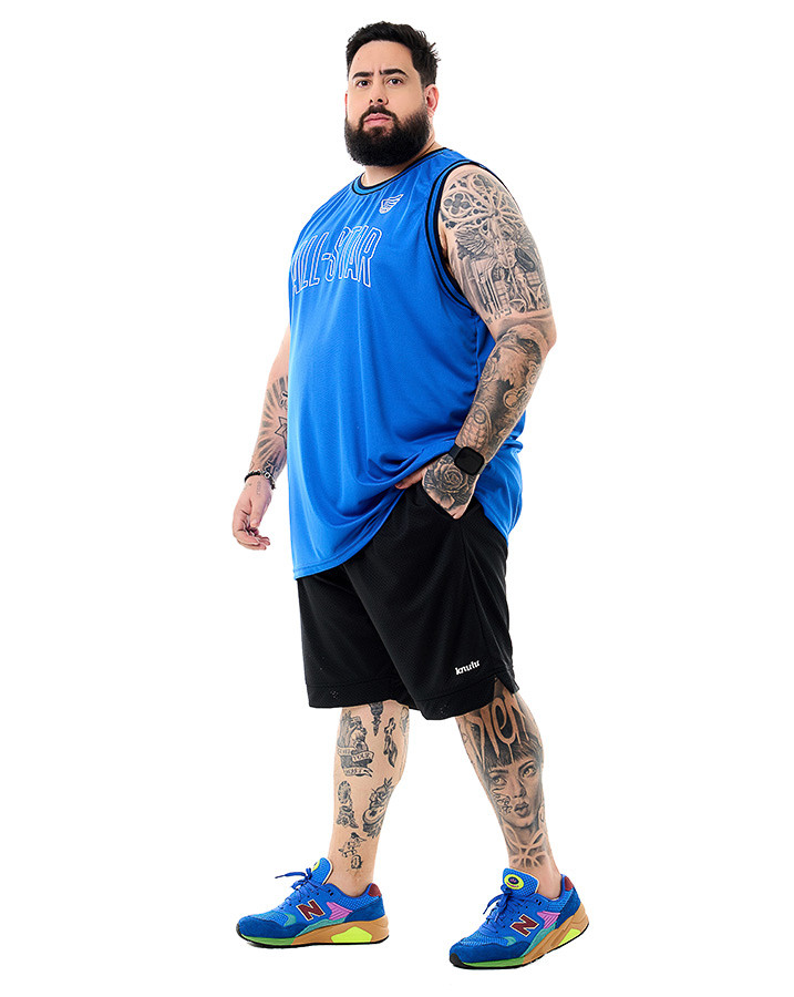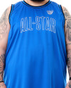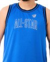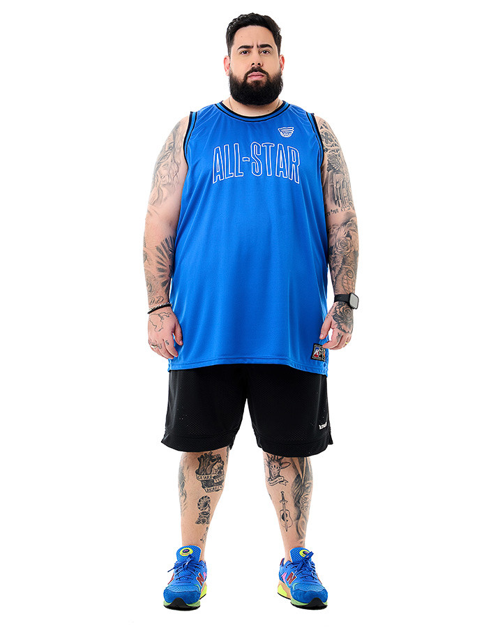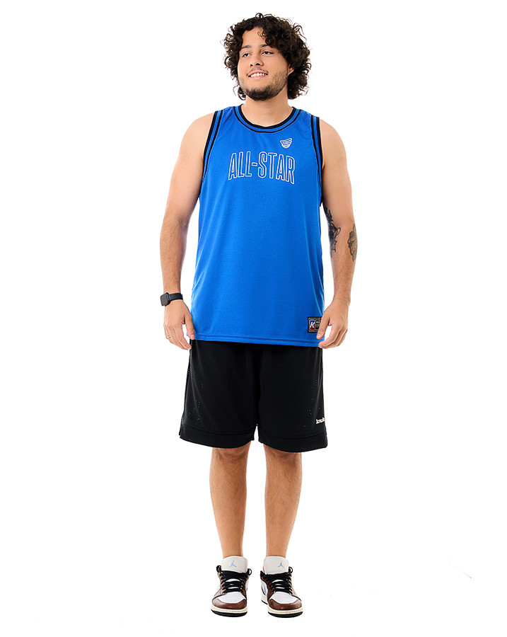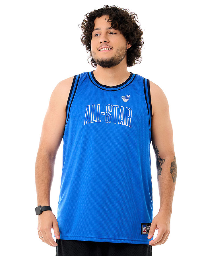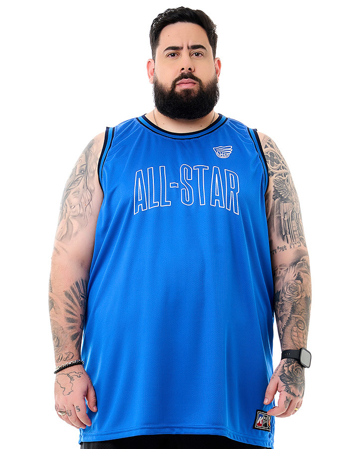 Com corte tradicional, gola careca e modelagem sem mangas, essa peça é perfeita para quem busca um visual moderno e versátil. O tecido com microfuros oferece ventilação superior, ideal para atividades físicas ou uso diário. A estampa central com a palavra "ALL-STAR" em branco com contorno preto adiciona um toque marcante ao design, destacando o estilo esportivo clássico.