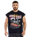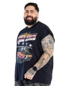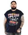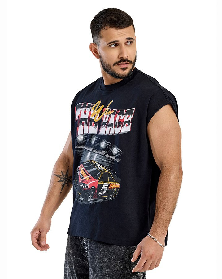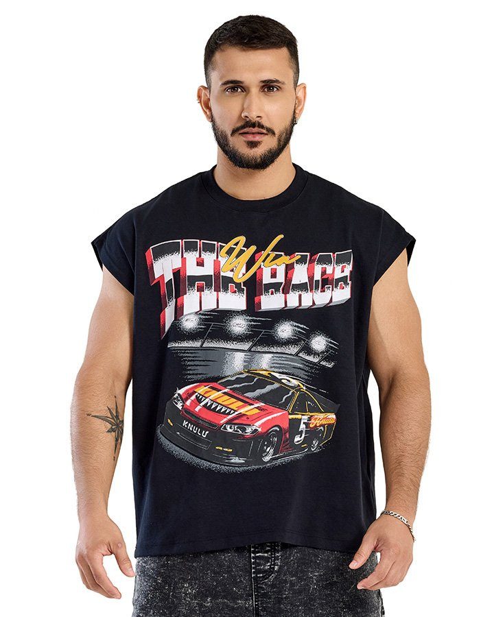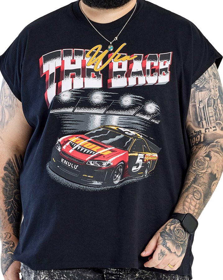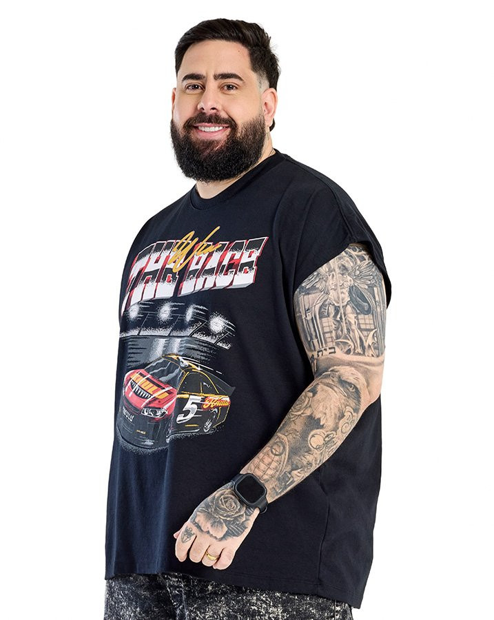 O corte machão cria uma silhueta mais marcada nos ombros, enquanto a estampa em silk screen traz o impacto gráfico do carro de corrida com acabamento de alta definição. A aplicação frontal amplia a presença visual da peça, e a etiqueta lateral complementa o design.
