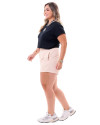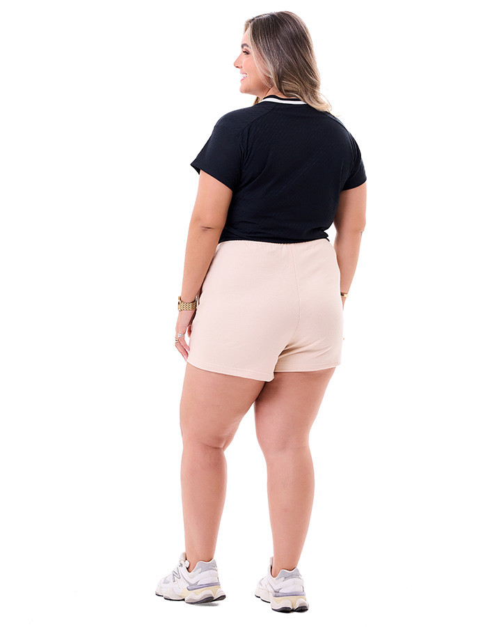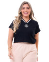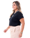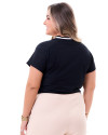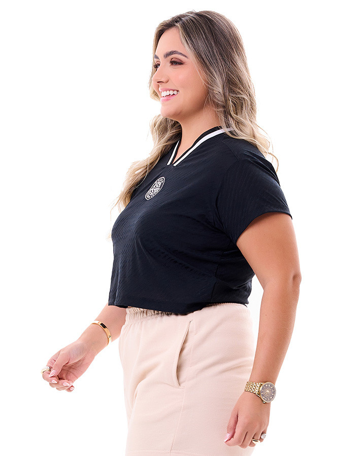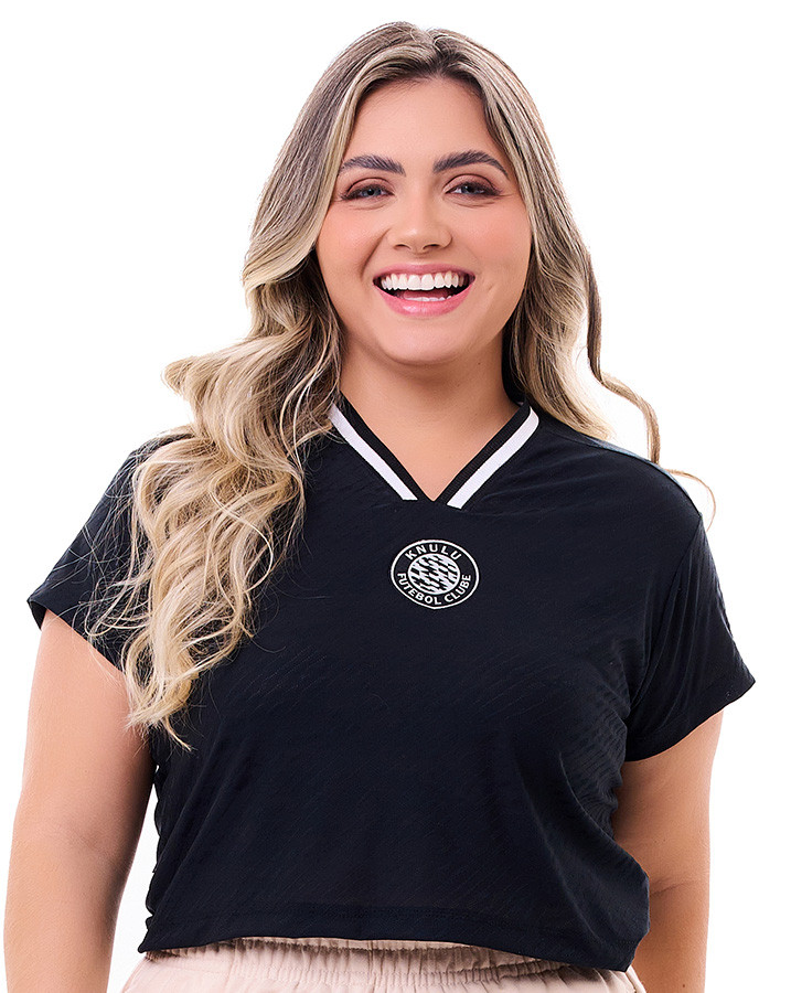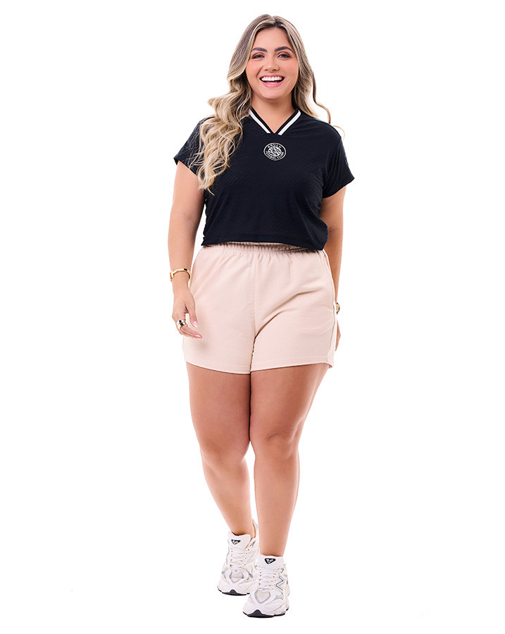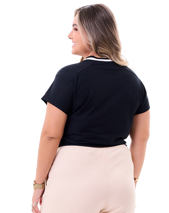 Com modelagem cropped e caimento solto, proporciona liberdade de movimento. A gola V com recorte em ribana bicolor adiciona um contraste sutil, enquanto as mangas curtas e amplas conferem um visual moderno e despojado.